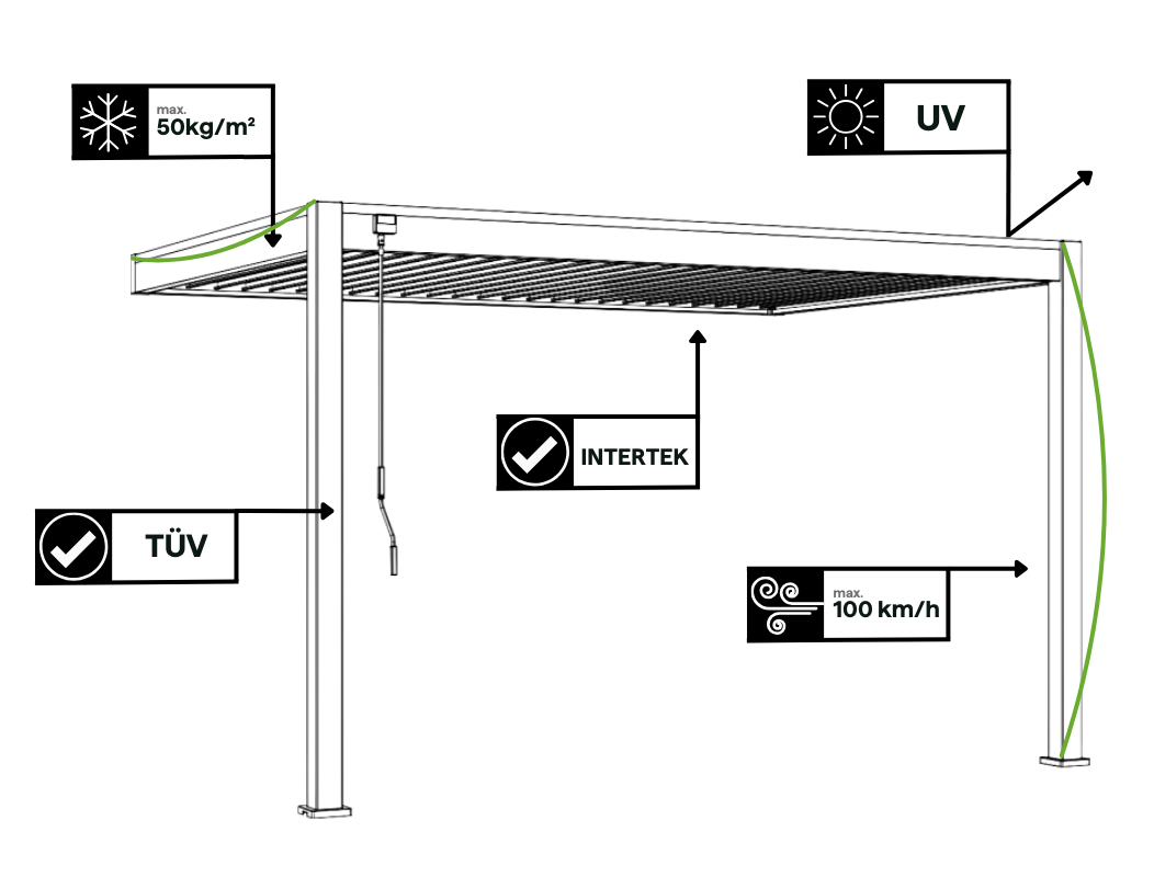 Pergola wyróżnia się wyjątkową trwałością i stabilnością, dzięki czemu sprawdzi się w każdych warunkach pogodowych. Konstrukcja wytrzymuje podmuchy wiatru do 100 km/h, co gwarantuje bezpieczeństwo nawet przy silniejszych wichurach. Dach jest odporny na obciążenie śniegiem do 50 kg/m², zapewniając ochronę również zimą. Solidne aluminium malowane proszkowo skutecznie chroni przed korozją i promieniowaniem UV, dzięki czemu pergola zachowuje estetyczny wygląd przez długie lata. Jakość i bezpieczeństwo potwierdzają certyfikaty TÜV i Intertek.
