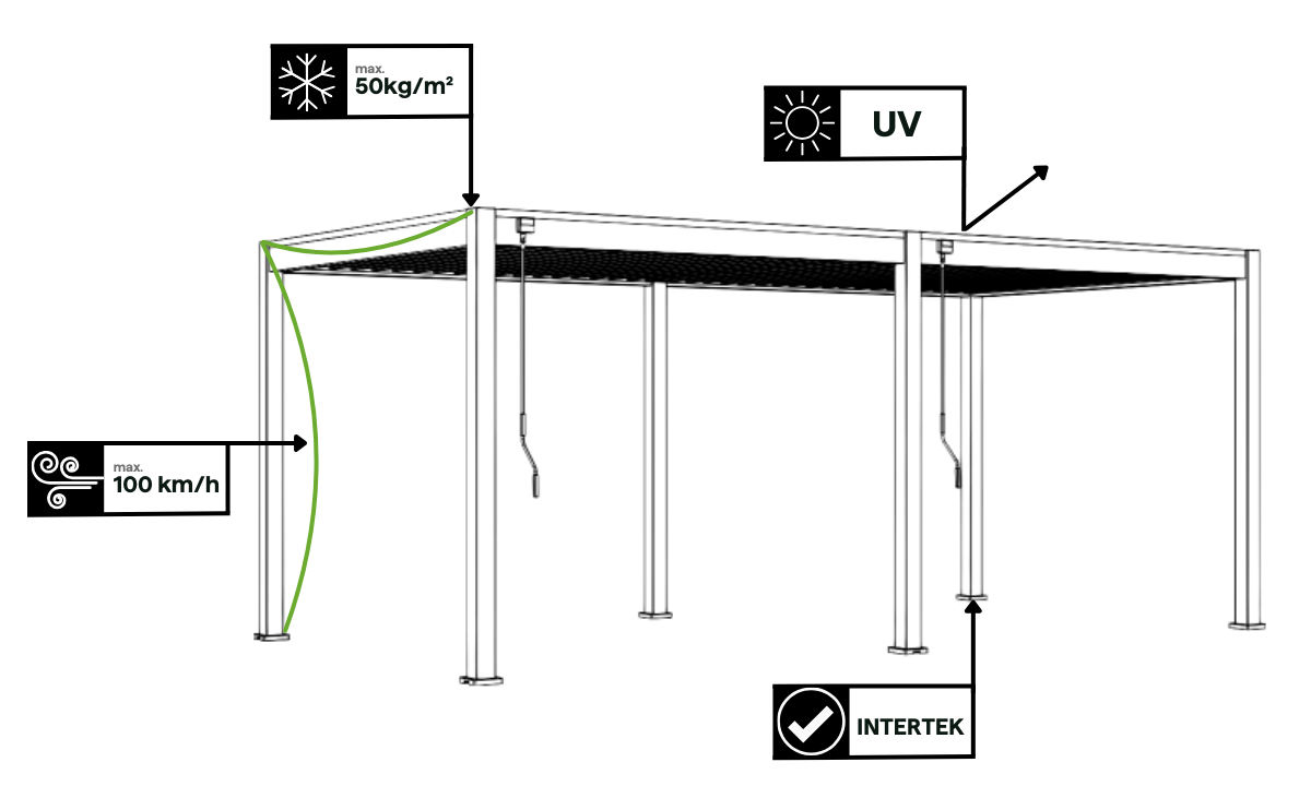 Pergola została zaprojektowana z myślą o długotrwałym użytkowaniu nawet w trudnych warunkach atmosferycznych. Jej mocna konstrukcja wytrzymuje podmuchy wiatru dochodzące do 100 km/h, a dach bez problemu radzi sobie z obciążeniem śniegiem do 50 kg/m², zapewniając bezpieczeństwo przez cały rok. Wykonanie z odpornego na korozję aluminium pokrytego powłoką proszkową chroni przed działaniem czynników zewnętrznych i pozwala zachować elegancki wygląd przez wiele lat. Wysoki standard wykonania potwierdzają prestiżowe certyfikaty TÜV oraz Intertek.