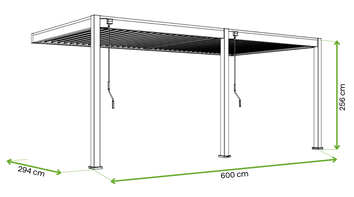 Podczas montażu pergoli należy zachować niewielki spadek – około 0,5˚, co odpowiada 1 cm na każde 1 metr długości – aby zapewnić skuteczne odprowadzanie wody deszczowej. Takie rozwiązanie zapobiega jej gromadzeniu się na dachu, co zwiększa komfort i trwałość konstrukcji. Więcej informacji znajduje się w Instrukcji.