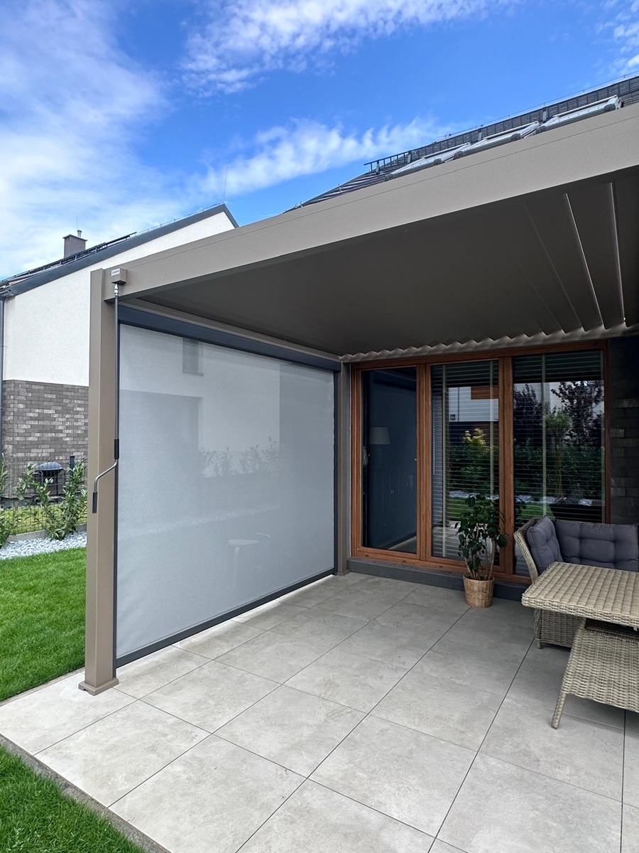 Automatyczna roleta pionowa Gutroof zapewnia więcej niż tylko barierę przeciwsłoneczną lub wiatrową – umożliwia ona stworzenie wszechstronnej przestrzeni na Twoim tarasie bądź w ogrodzie. Dzięki opcji instalacji na jednej lub kilku bocznych częściach pergoli, możesz bez problemu dopasować ją do swoich osobistych wymagań.