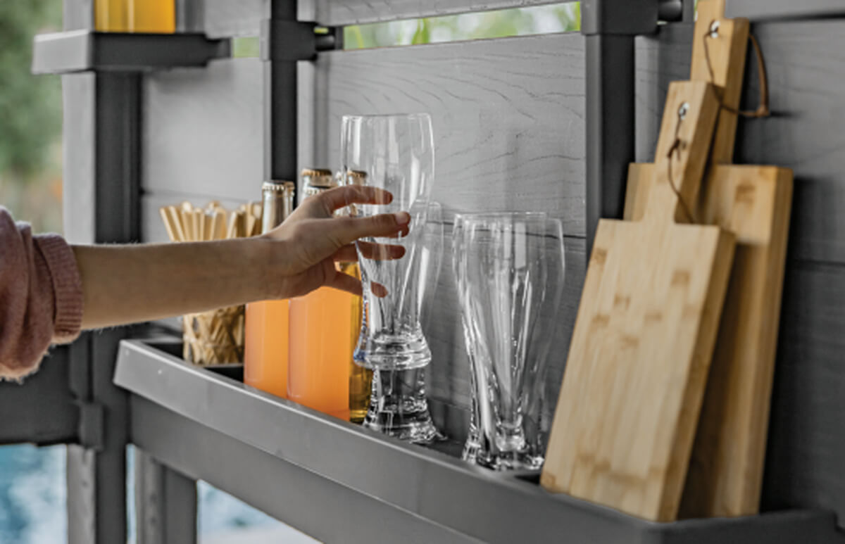 Specjalnie zaprojektowana półka pomieści niezbędne akcesoria barowe, takie jak deski do krojenia, szklanki czy butelki. Dzięki niej wszystko, co potrzebne do serwowania napojów i przekąsek, masz zawsze w zasięgu ręki.