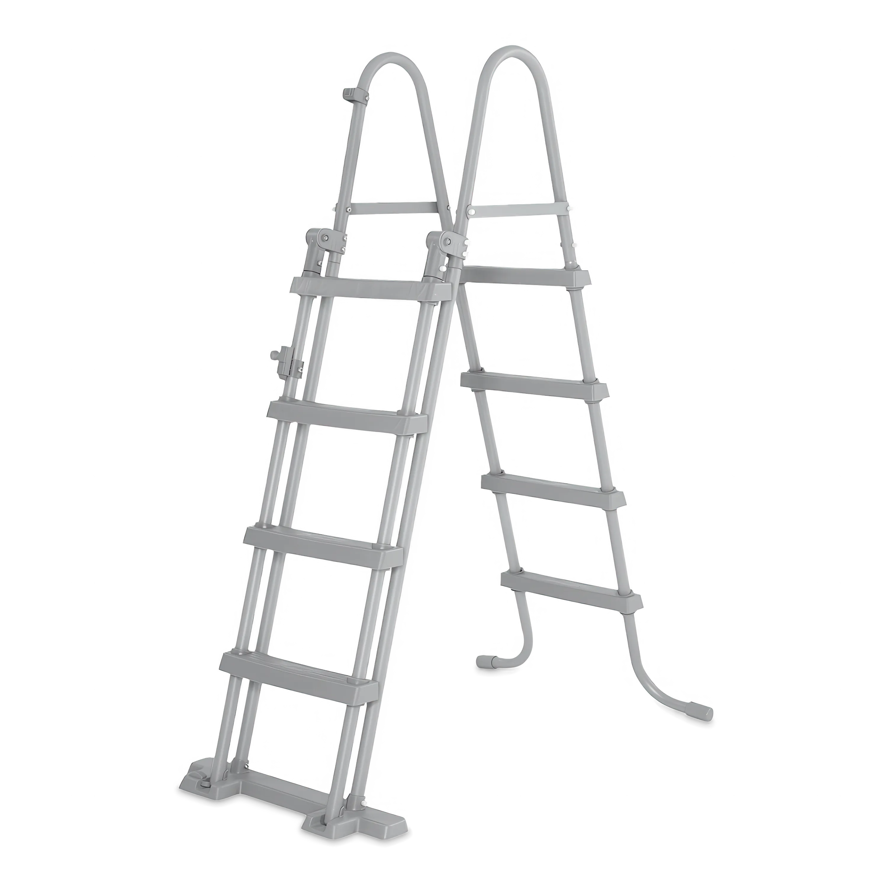 - Zewnętrzną część drabiny można zabezpieczyć w pozycji pionowej, aby uniemożliwić dzieciom wchodzenie do basenu bez nadzoru