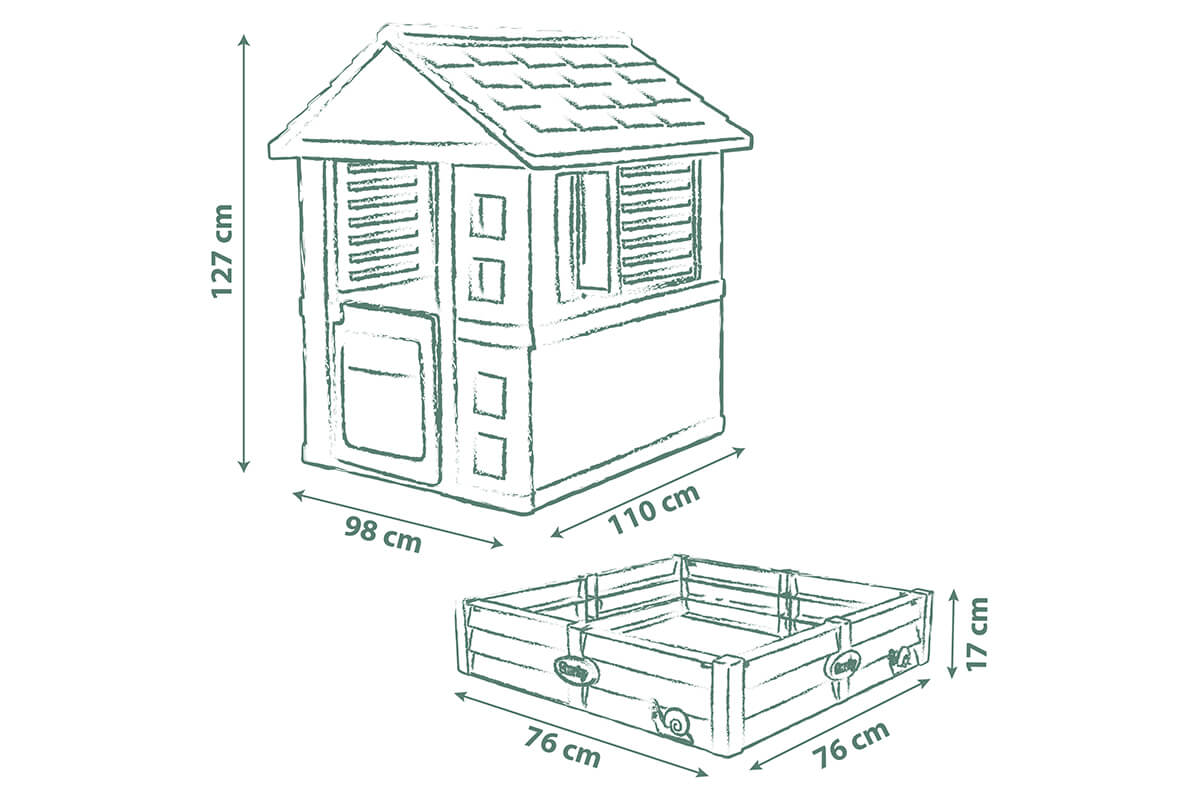 Dołączona piaskownica (76 x 76 cm) daje możliwość różnorodnej zabawy – można w niej tworzyć zamki z piasku lub przekształcić ją w mini ogródek warzywny, ucząc dzieci dbałości o rośliny.