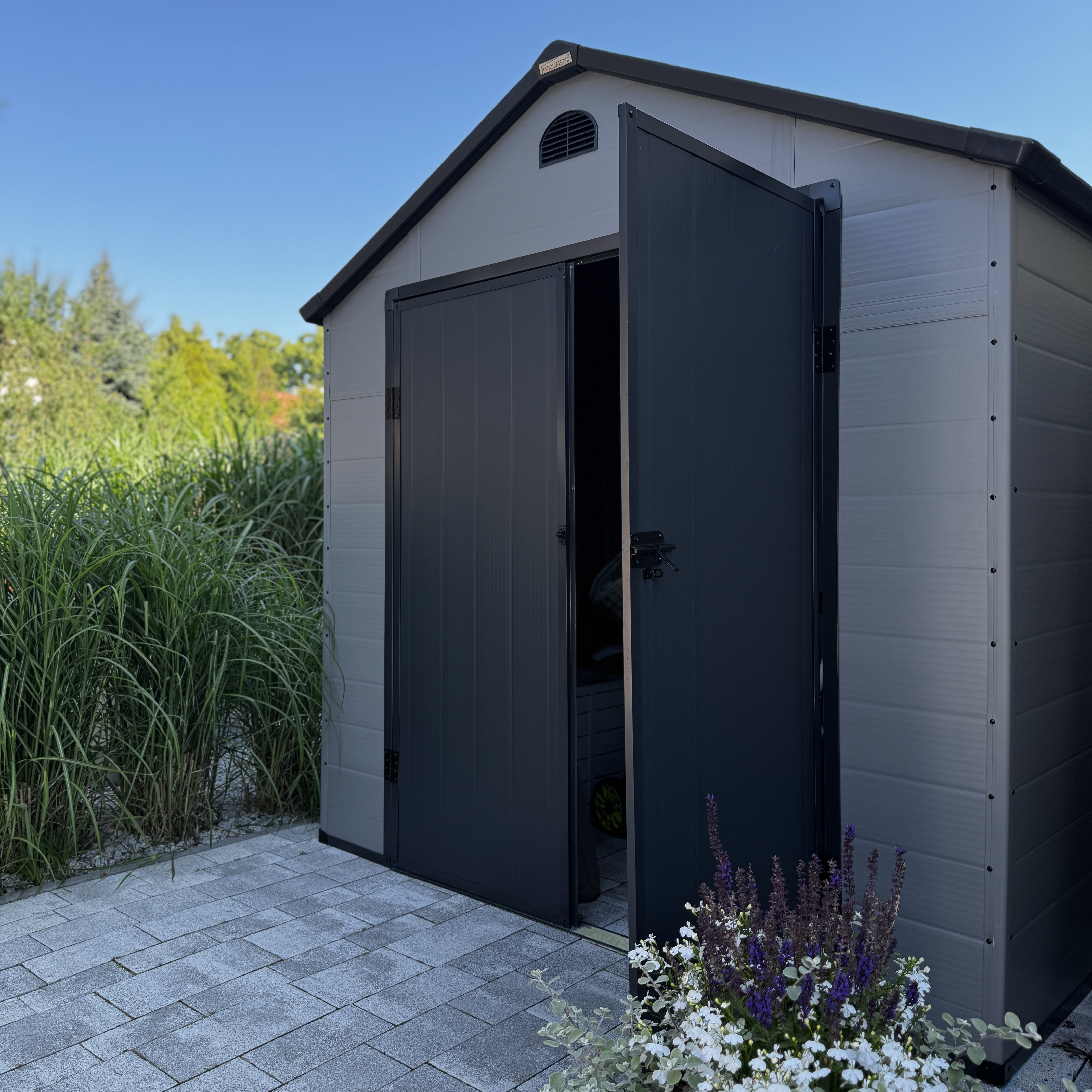 Model VERMONT został wyposażony w podwójne drzwi, które zapewniają łatwy dostęp do wnętrza. Solidny zamek na rygiel umożliwia zamontowanie kłódki (brak w zestawie), zwiększając ochronę przed dostępem osób trzecich.