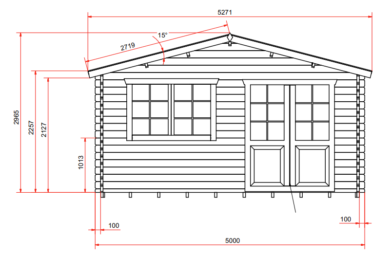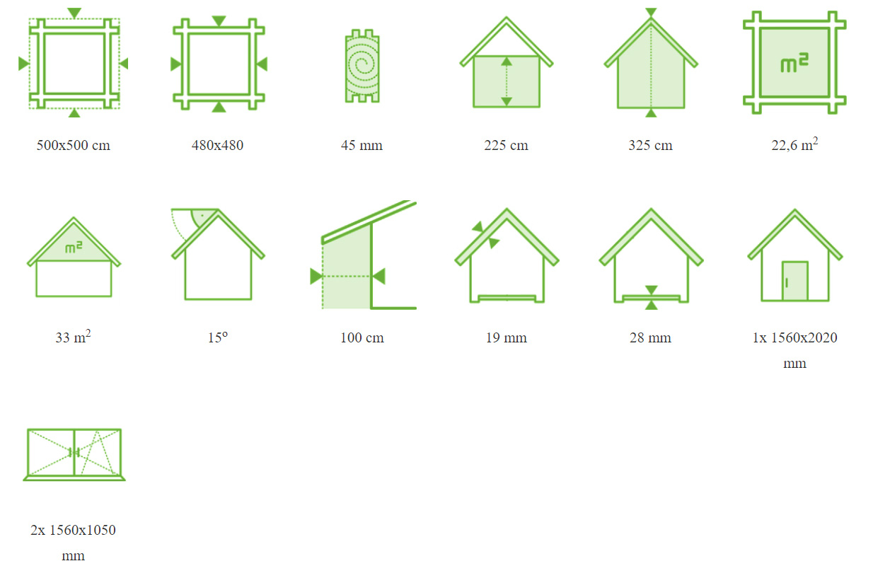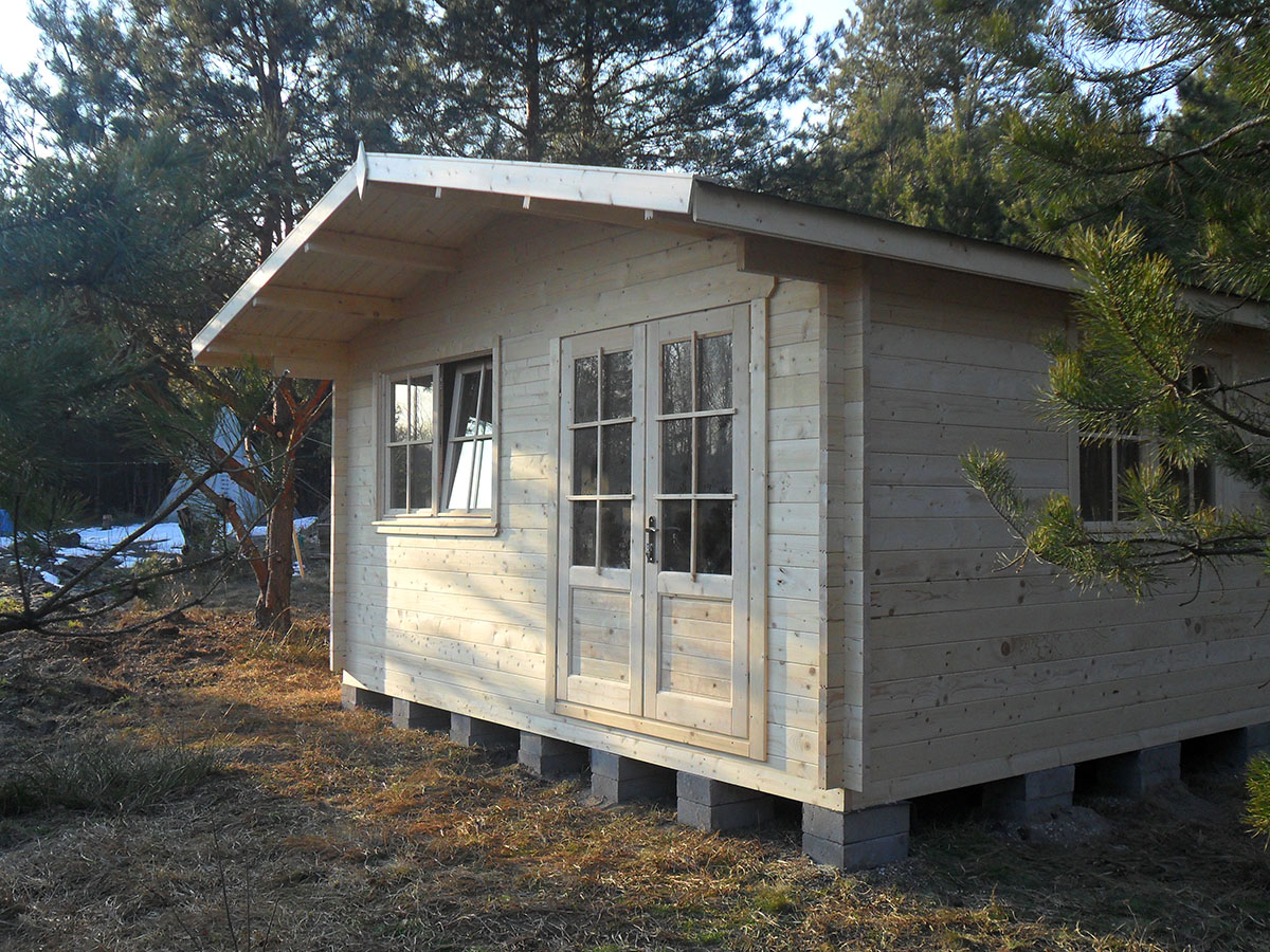 Drewniany domek parterowy Ishtar 5x5 to budynek o niewielkim metrażu, dzięki czemu kwalifikuje się do budowy bez pozwolenia budowlanego. Można złożyć go samodzielnie lub skorzystać z usługi montażu dostępnej również w wersji z impregnacją legarów. Ishtar 5x5 to projekt, który można zaaranżować na wiele sposobów: jako domek letniskowy, biuro czy domek rekreacyjny na działce ROD. Ishtar 5x5 to budynek wykonany z litych bali świerkowych o grubościach: ściany – 45 mm, podłogi – 28 mm i dachu – 19 mm. Zastosowany materiał i jego precyzja obróbka zaowocowały powstaniem niezwykle solidnego i stabilnego domku. Wymiary Ishtar 5x5 wraz z wystającymi elementami to 500x500 cm (wym. bez wystających elementów 480x480 cm). Powierzchnia użytkowa domku to 22,6 m2. Ishtar 5x5 to domek składający się z jednego pomieszczenia. Na życzenie klienta wnętrze można podzielić ściankami działowymi i wydzielić w ten sposób kilka pokojów. Prosta konstrukcja domku daje szerokie możliwości jego aranżacji i modyfikacji wedle preferencji przyszłych właścicieli.