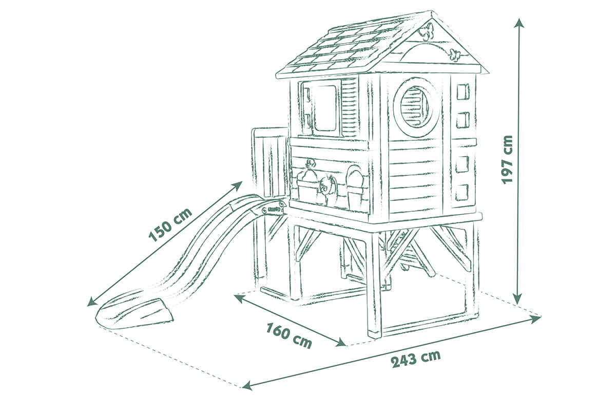 Domek na palach marki Smoby to nie tylko miejsce do zabawy, lecz prawdziwa oaza radości dla Twojego dziecka! Umiejscowiona na wysokości 70 cm weranda dostarcza maluchom niezapomnianych widoków na otoczenie, zachęcając do kreatywnych gier z przyjaciółmi. Wyjątkową atrakcją jest stabilna, antypoślizgowa drabinka oraz zjeżdżalnia o imponującej długości 150 cm. Co więcej, zjeżdżalnię można zamienić w zjeżdżalnię wodną, podłączając wąż ogrodowy – idealna opcja na letnie dni pełne radości! Domek, zabezpieczony przed promieniowaniem UV, gwarantuje długotrwałą jakość i kolorystykę, pozostając niezmienionym przez wiele lat intensywnej zabawy. Zaokrąglone brzegi, wygrawerowane zwierzątka i kwiaty na ścianach, przesuwane okiennice, a także solidne, połówkowe drzwi sprawiają, że każdy detal został zaprojektowany z myślą o komforcie i estetyce zabawy. Dodatkowe wyposażenie to możliwość zamontowania elektronicznego dzwonka do drzwi, informującego o przybyciu gości – idealne do rozwijania wyobraźni podczas różnorodnych scenariuszy zabaw. Wymiary domku - 260 x 160 x wysokość 197 cm, sprawiają, że jest on bezpieczny i idealny dla dzieci od 2 lat. Dodatkowo, dostępne są kompatybilne akcesoria, takie jak podłoga, dzwonek, zraszacz i piaskownica, sprzedawane oddzielnie, aby jeszcze bardziej urozmaicić i dostosować przestrzeń zabawy. Smoby to marka z ponad 90-letnim doświadczeniem, znana z trwałych i bezpiecznych zabawek. Wybierając Smoby, inwestujesz w rozwój i bezpieczeństwo swojego dziecka, czerpiąc radość z francuskiej tradycji w tworzeniu wyjątkowych produktów dla najmłodszych.