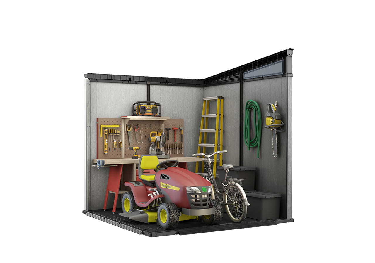 W środku zmieścisz wszystko, co potrzebne w ogrodzie – od narzędzi po duże sprzęty. Dobrze przemyślana konstrukcja i pionowe ściany sprawiają, że każdy centymetr przestrzeni ma znaczenie.