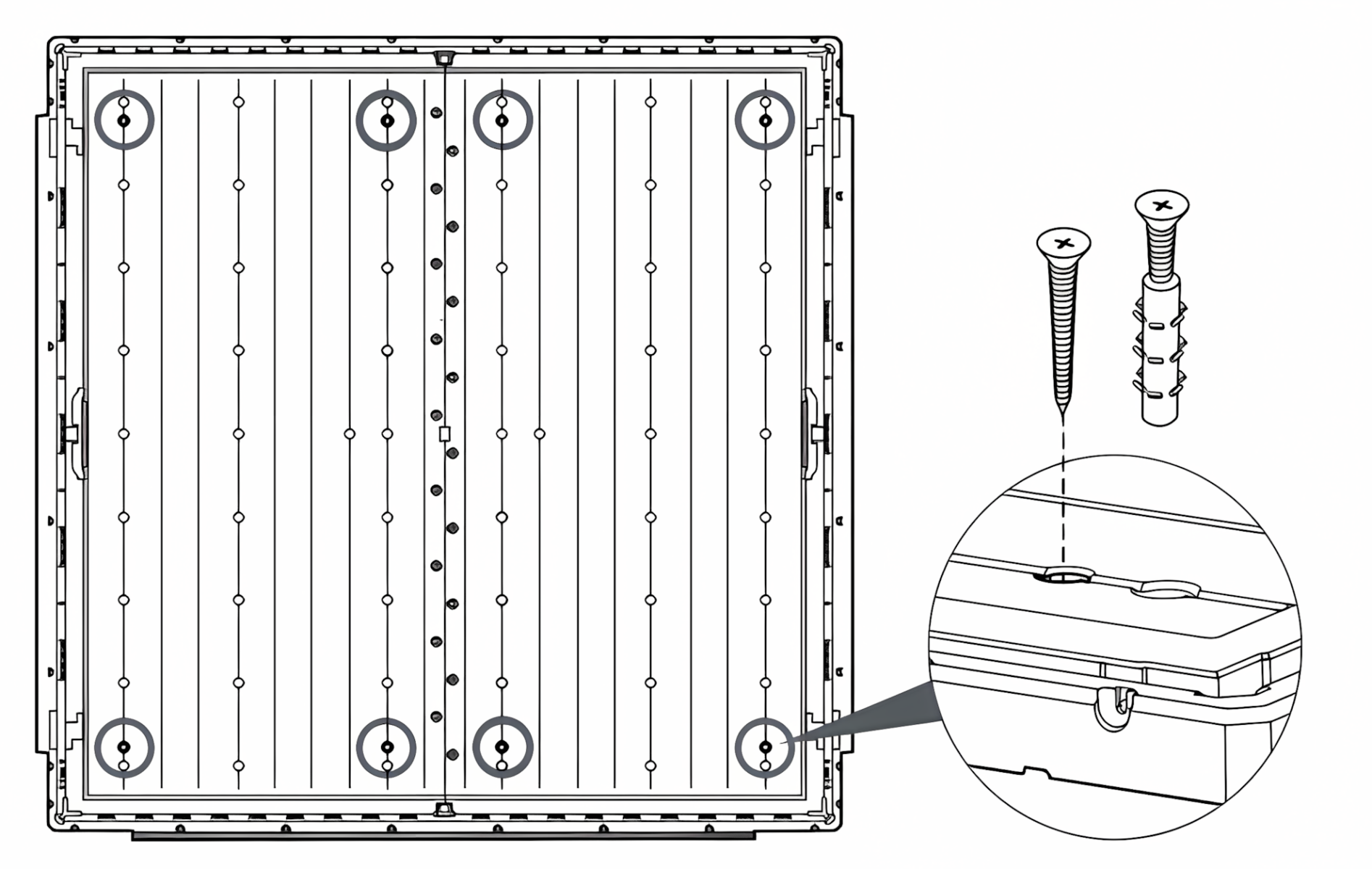 Dla zapewnienia maksymalnej stabilności domek warto przymocować do podłoża. W podłodze umieszczono specjalne punkty montażowe, które umożliwiają łatwe zakotwienie za pomocą odpowiednich śrub (niedołączonych do zestawu).