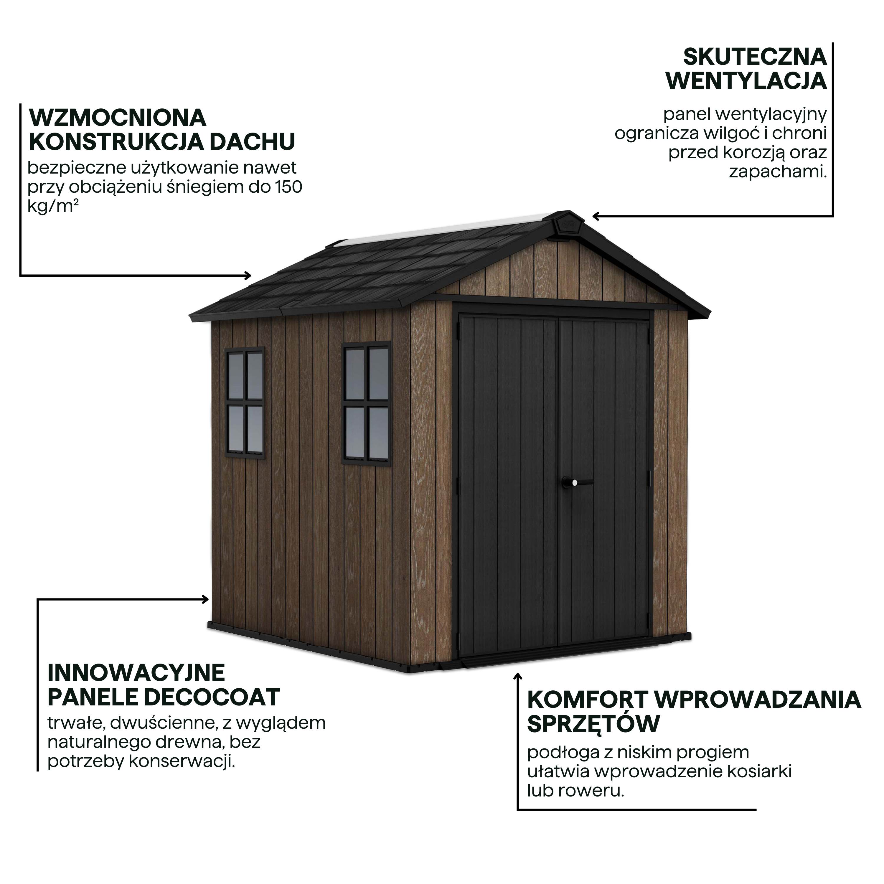 Domek narzędziowy DECO APEX 757/775 WALNUT marki Keter to funkcjonalna konstrukcja ogrodowa wzmocniona stalą. Domek posiada dwa okna w stylu wiktoriańskim i świetliki, które doświetlają wnętrze. Domek jest bezobsługowy i nie wymaga żadnej konserwacji. Trwała, odporna na rdzę konstrukcja z wbudowaną wentylacją i szerokimi drzwiami zapewnia bezpieczeństwo oraz idealne warunki przechowywania sprzętu ogrodowego.