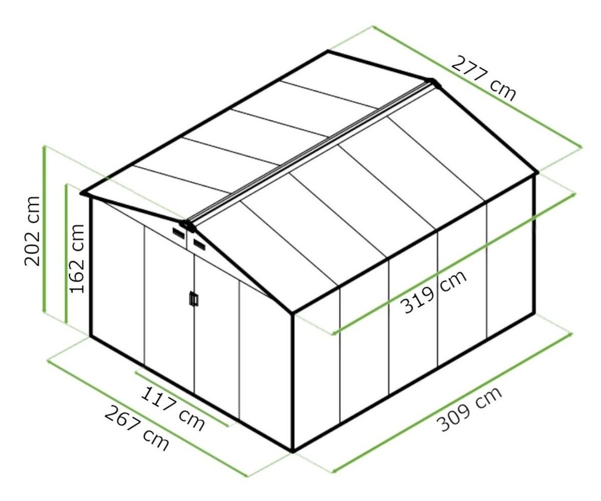 HUDSON 277x319 cm to przestronny domek narzędziowy, zapewniający aż 8,25 m² powierzchni użytkowej na narzędzia i sprzęty ogrodowe. Konstrukcja z ocynkowanej stali charakteryzuje się doskonałą odpornością na korozję i trwałością, co sprawia, że domek służy przez wiele lat. Praktyczne, przesuwne drzwi umożliwiają łatwe korzystanie z wnętrza, a opcja zamknięcia ich na kłódkę zapewnia dodatkowe bezpieczeństwo. Domek został wyposażony w otwory wentylacyjne, które skutecznie zapobiegają gromadzeniu się wilgoci, chroniąc zawartość przed pleśnią i korozją.