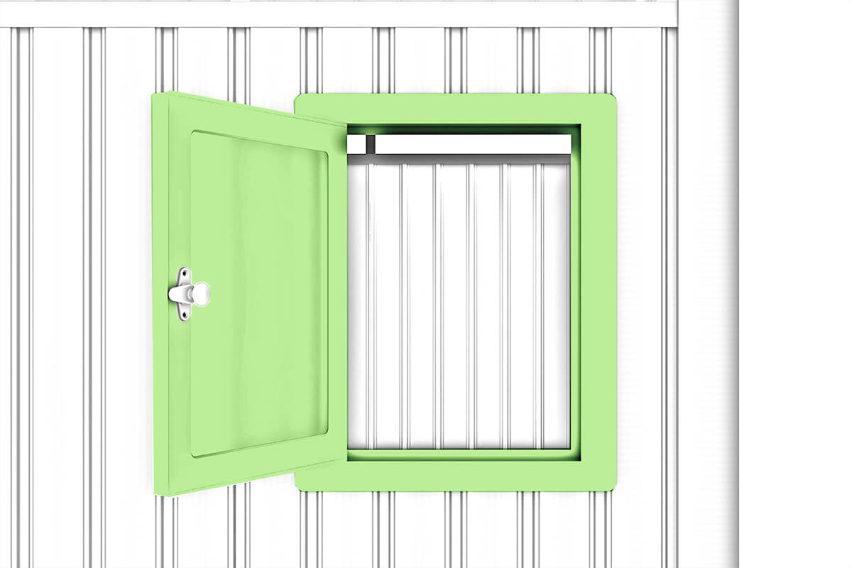 Domek wyposażony jest w jedno magnetyczne okno PC, które po pełnym otwarciu stabilnie przylega do ściany, zapewniając bezpieczeństwo i wygodę użytkowania. Dzięki solidnemu mocowaniu okno wytrzymuje nawet silne podmuchy wiatru, co zwiększa trwałość i funkcjonalność konstrukcji.
