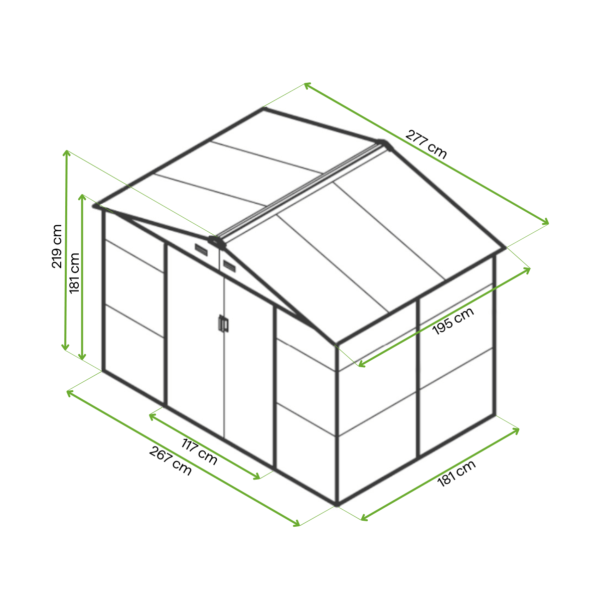 - Dostępne rozmiary domku: 277x323 cm | 277x259 cm