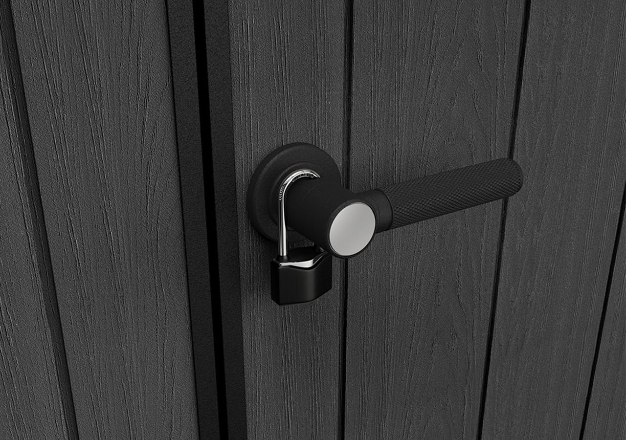 Solidna konstrukcja drzwi gwarantuje trwałość, a stalowy zamek z możliwością założenia kłódki skutecznie zabezpiecza wnętrze przed niepowołanym dostępem.