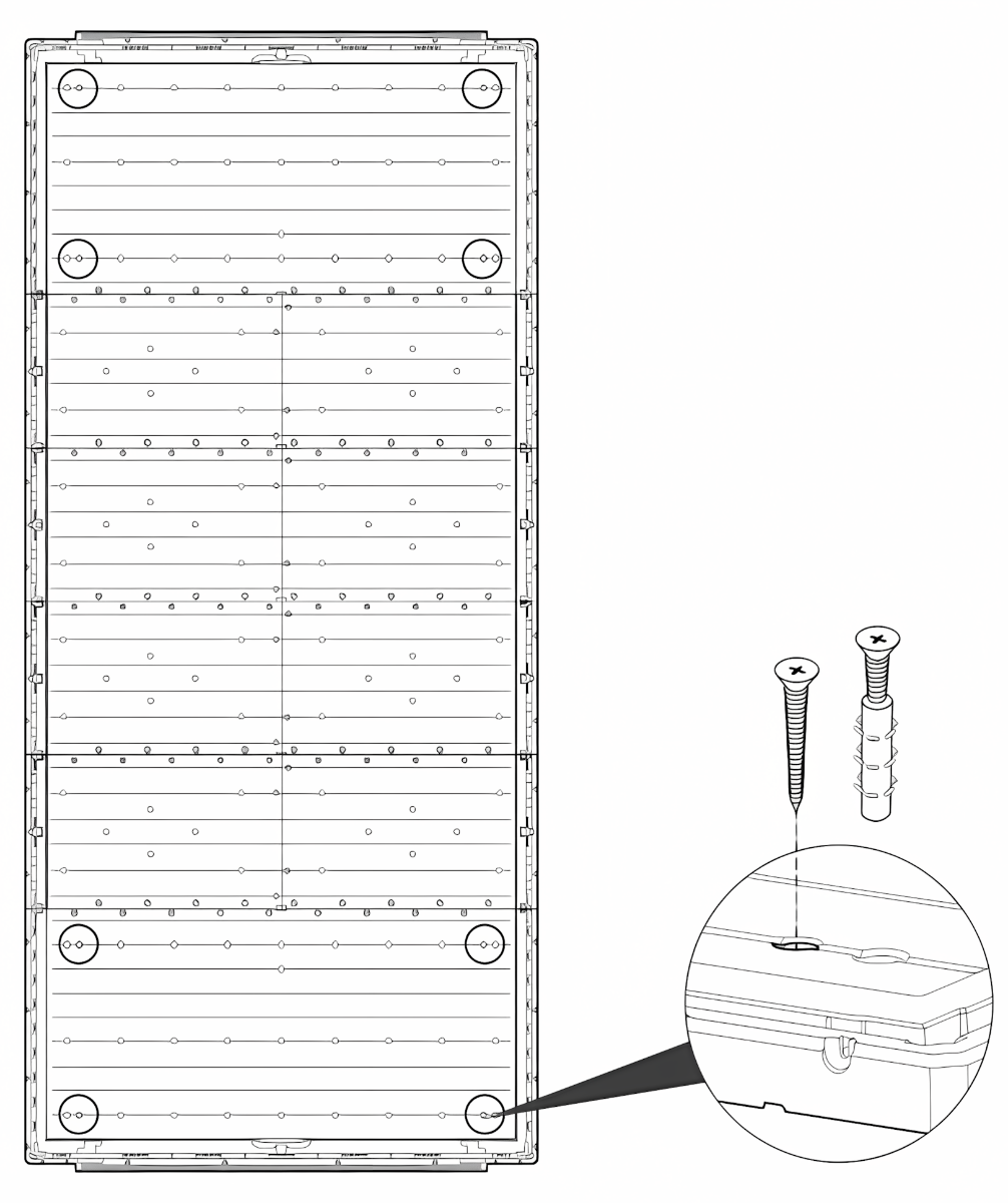 Dla pełnej stabilności zaleca się przymocowanie domku Keter Oakland 7511 do podłoża. W podłodze znajdują się dedykowane punkty montażowe ułatwiające przytwierdzenie za pomocą odpowiednich śrub (brak w zestawie).