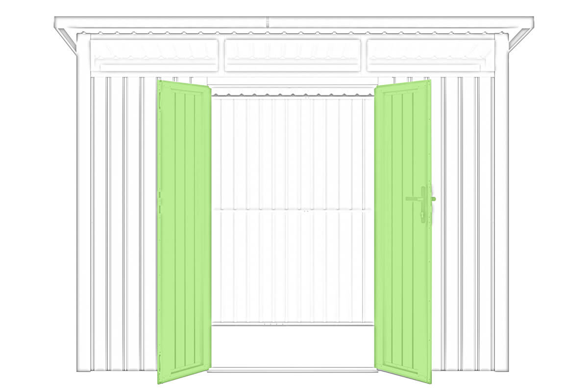 Podwójne drzwi na zawiasach zapewniają szerokie i wygodne wejście do wnętrza domku, ułatwiając wnoszenie większych narzędzi czy sprzętów ogrodowych. Ich fabryczne wstępne zmontowanie przyspiesza montaż i gwarantuje precyzyjne dopasowanie elementów. Solidna konstrukcja drzwi zwiększa trwałość oraz bezpieczeństwo użytkowania.