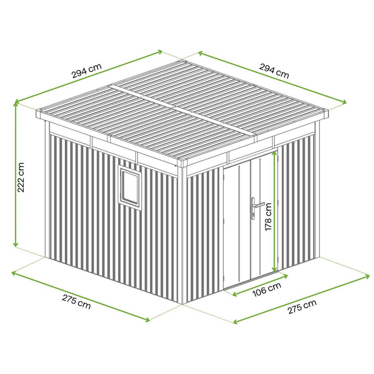 OTTAWA 294 x 294cm to praktyczny domek narzędziowy o całkowitej powierzchni 8,64 m ². Stal ocynkowana, z której wykonana jest konstrukcja, zapewnia ochronę przed korozją i gwarantuje trwałość przez lata. Domek wyposażony jest w otwory wentylacyjne, które zapewniają odpowiednią cyrkulację powietrza wewnątrz, zapobiegając wilgoci i nieprzyjemnym zapachom. W domku znajdują się podwójne drzwi na zawiasach, które są zamykane na klucz, co zapewnia bezpieczeństwo przechowywanych przedmiotów.