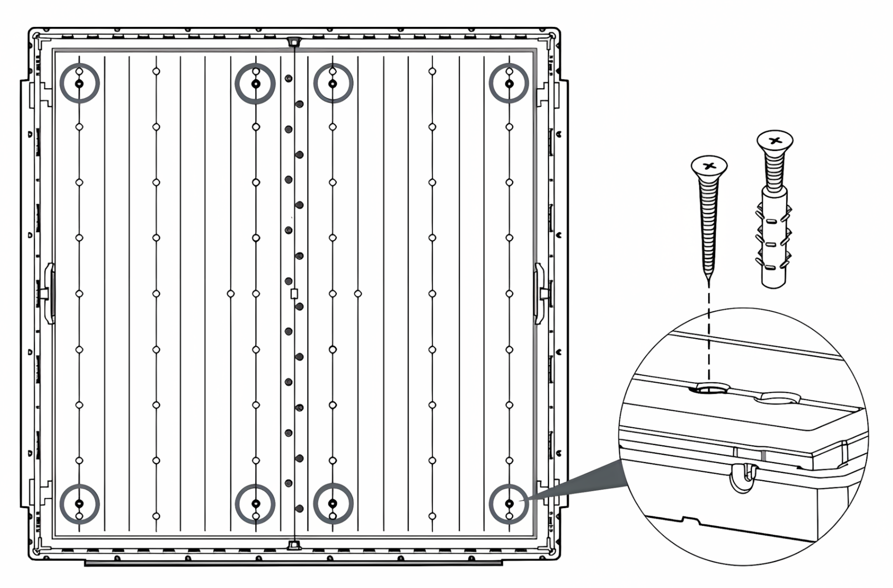 Dla pełnej stabilności zaleca się przymocowanie domku do podłoża. W podłodze znajdują się dedykowane punkty montażowe ułatwiające przytwierdzenie za pomocą odpowiednich śrub (brak w zestawie).