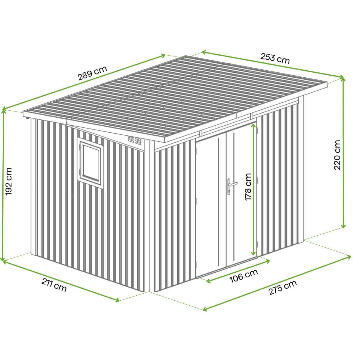 PORTLAND 289 x 253cm to solidny domek narzędziowy o całkowitej powierzchni 7,31 m ². Wykonany z wysokiej jakości stali ocynkowanej ogniowo, malowanej proszkowo na elegancki, szary kolor. Konstrukcja wyróżnia się wyższymi ścianami, co zapewnia wygodny dostęp i więcej przestrzeni do przechowywania narzędzi ogrodowych czy sprzętu. Wyposażony w podwójne, zamykane na klucz drzwi oraz praktyczne okno z poliwęglanu, które można zamontować z różnych stron budynku. Spadzisty dach z rynnami skutecznie odprowadza wodę, a trwała konstrukcja gwarantuje wysoką nośność śniegu.