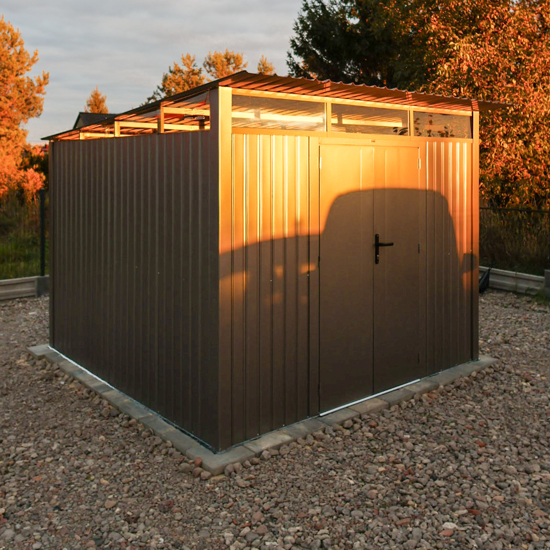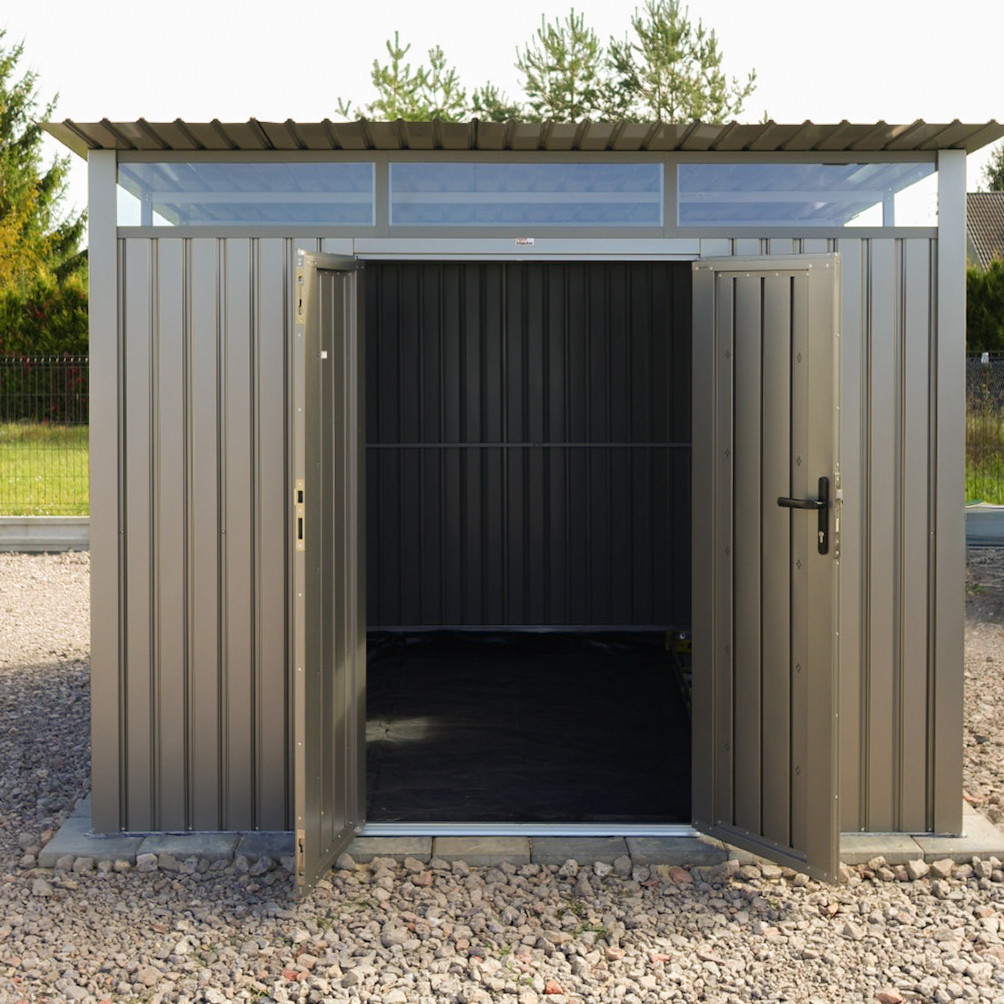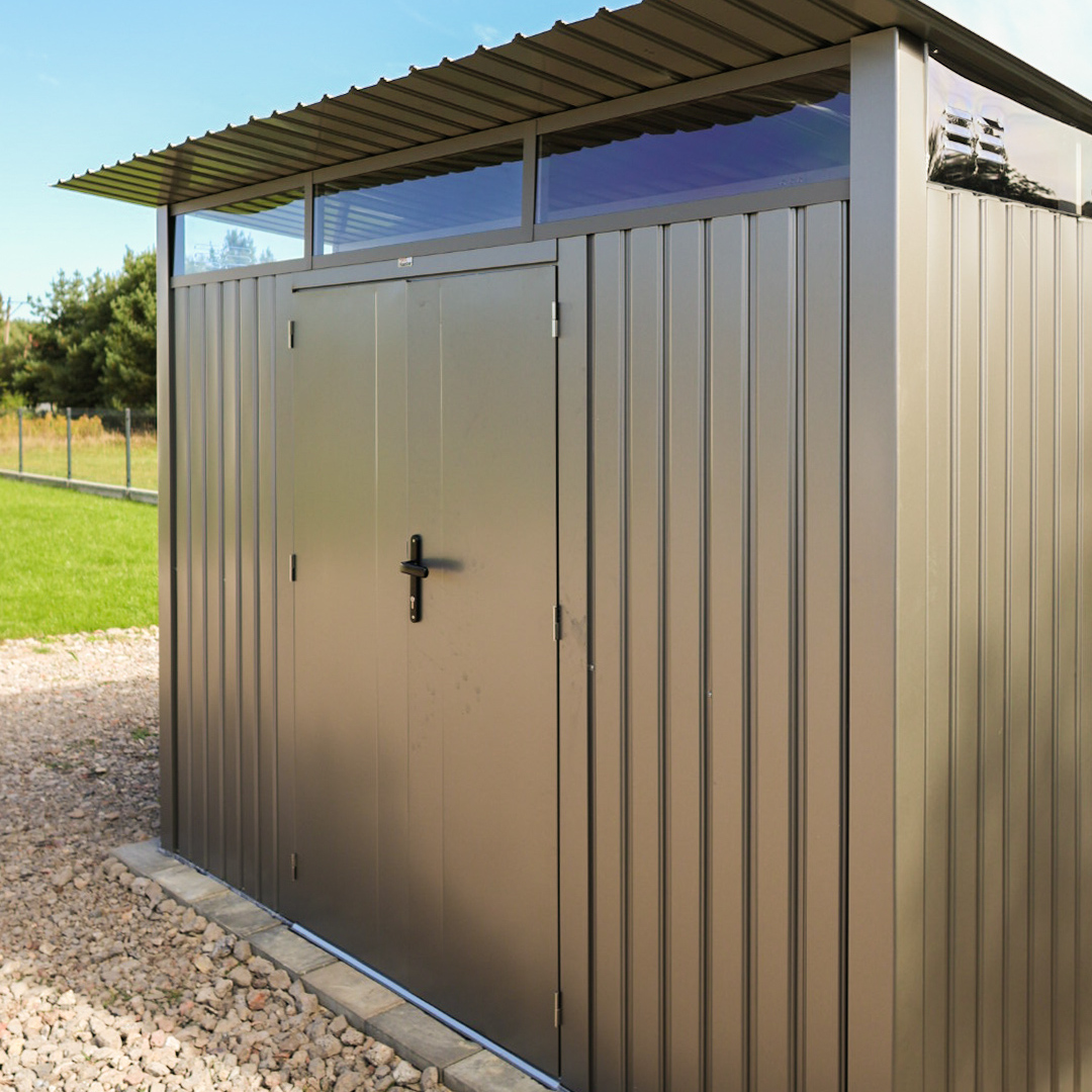 PORTLAND 289 x 318cm to praktyczny domek narzędziowy o całkowitej powierzchni 9,19 m ². Stalowa konstrukcja z powłoką ocynkowaną zapewnia ochronę przed korozją, dzięki czemu domek pozostaje wytrzymały i służy przez wiele lat. Model ten zapewnia przestronne wnętrze oraz wysokie ściany, które ułatwiają swobodne poruszanie się. Został wyposażony w praktyczne elementy, takie jak podwójne drzwi zamykane na klucz, magnetyczne okno z możliwością wyboru strony montażu oraz spadzisty dach z rynnami odprowadzającymi wodę. Estetyczny, szary kolor doskonale komponuje się z zielenią ogrodu.