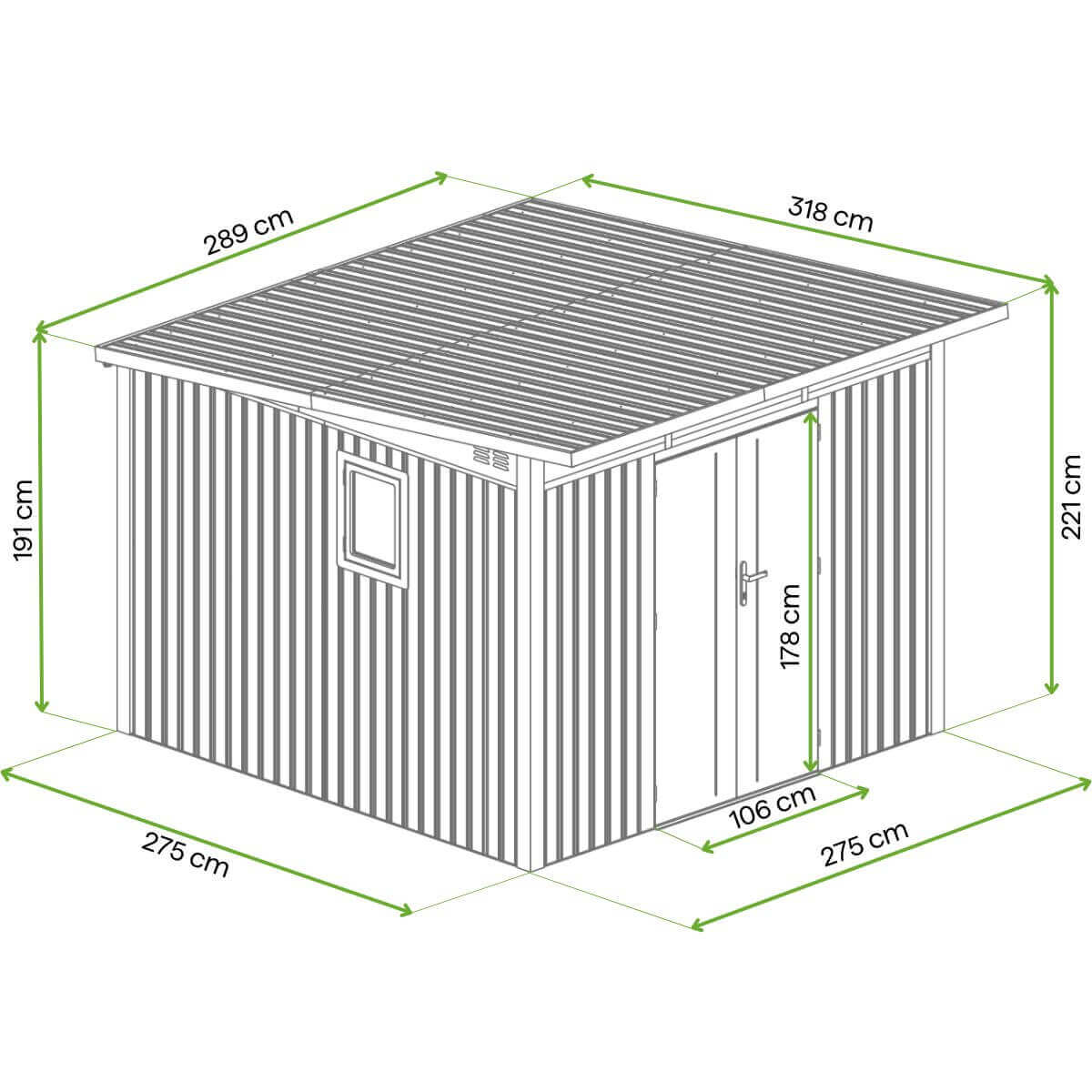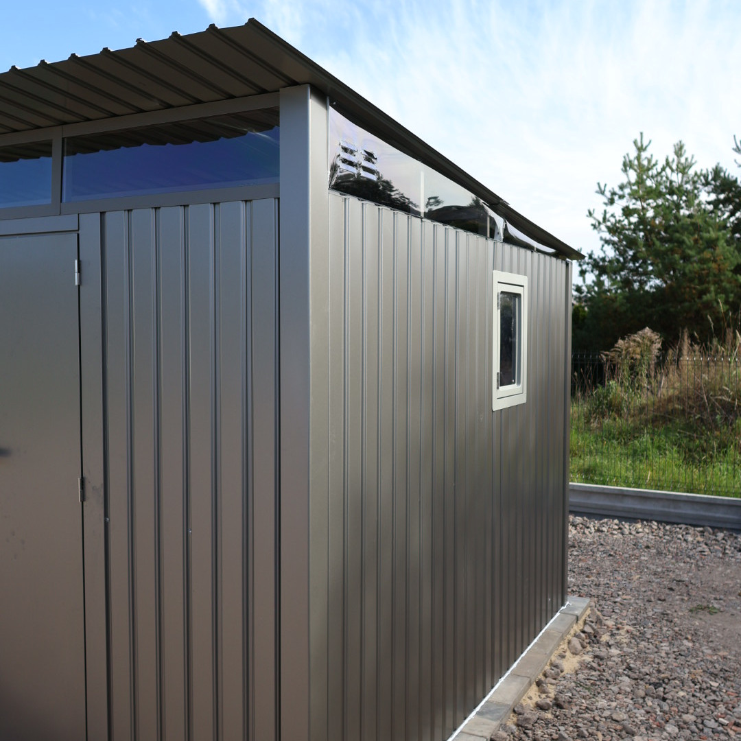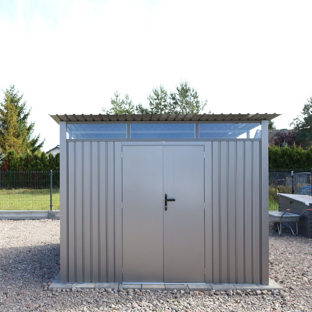 PORTLAND 289 x 318cm to praktyczny domek narzędziowy o całkowitej powierzchni 9,19 m ². Stalowa konstrukcja z powłoką ocynkowaną zapewnia ochronę przed korozją, dzięki czemu domek pozostaje wytrzymały i służy przez wiele lat. Model ten zapewnia przestronne wnętrze oraz wysokie ściany, które ułatwiają swobodne poruszanie się. Został wyposażony w praktyczne elementy, takie jak podwójne drzwi zamykane na klucz, magnetyczne okno z możliwością wyboru strony montażu oraz spadzisty dach z rynnami odprowadzającymi wodę. Estetyczny, szary kolor doskonale komponuje się z zielenią ogrodu.
