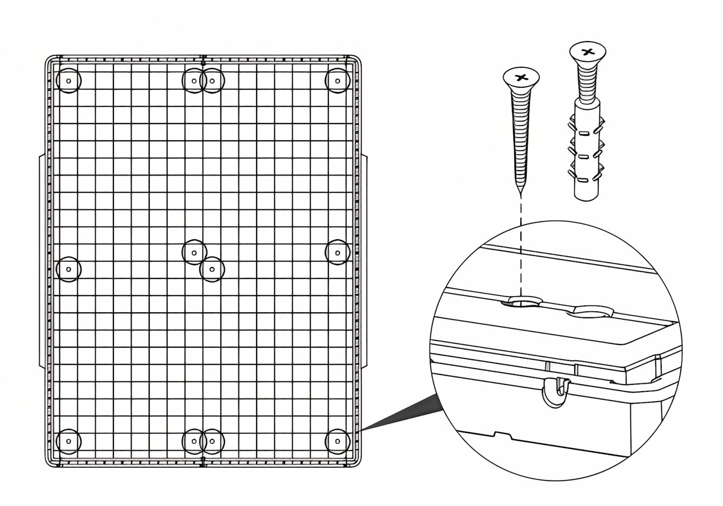 Dla zapewnienia maksymalnej stabilności zaleca się solidne przymocowanie domku do podłoża. W podłodze znajdują się specjalnie przygotowane punkty montażowe, które umożliwiają łatwe przytwierdzenie konstrukcji za pomocą odpowiednich śrub (brak w zestawie).