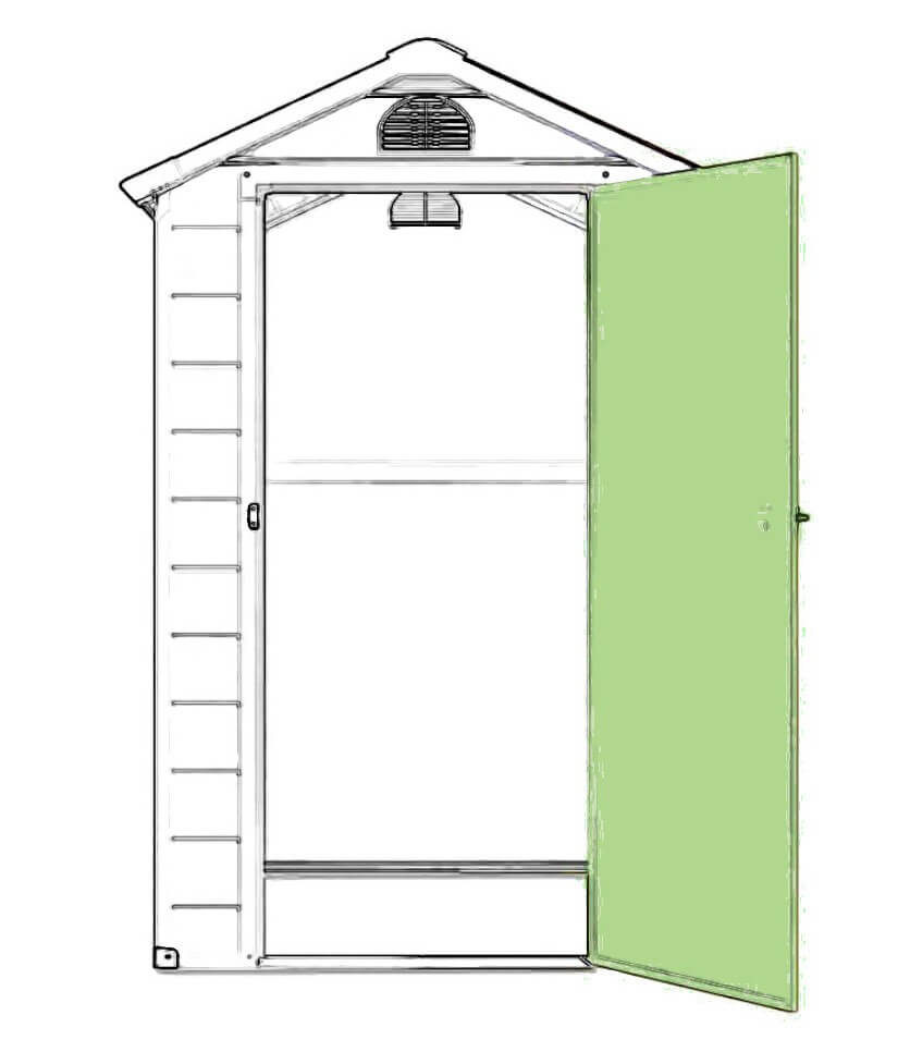 Domek VERMONT wyposażono w drzwi na zawiasach, które można dopasować do układu ogrodu, wybierając otwieranie na prawo lub lewo. Kompaktowy rozmiar drzwi pozwala na wygodne użytkowanie, niezależnie od wielkości działki. Rygiel umożliwia zabezpieczenie dodatkową kłódką (brak w zestawie), chroniąc zawartość domku.