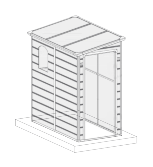 Przed rozpoczęciem montażu upewnij się, że wylewka betonowa jest odpowiednio wyrównana i całkowicie sucha. Montaż domku na nierównej powierzchni może prowadzić do niestabilności konstrukcji. W zestawie nie znajdują się kotwy montażowe do podłoża.
