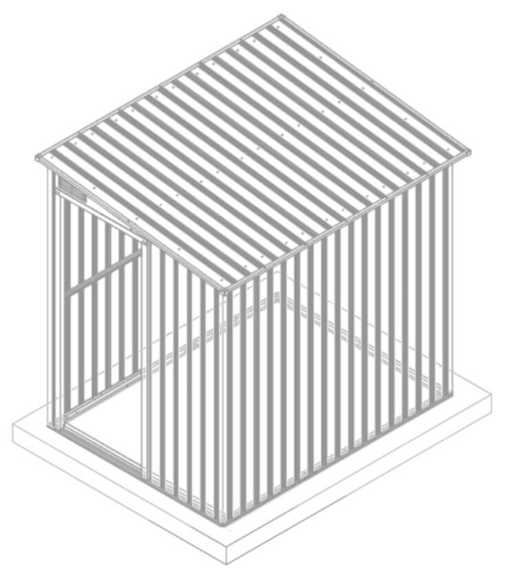 Przed rozpoczęciem montażu upewnij się, że wylewka betonowa jest odpowiednio wyrównana i całkowicie sucha. Montaż domku na nierównej powierzchni może prowadzić do niestabilności konstrukcji. W zestawie nie znajdują się kotwy montażowe do podłoża.