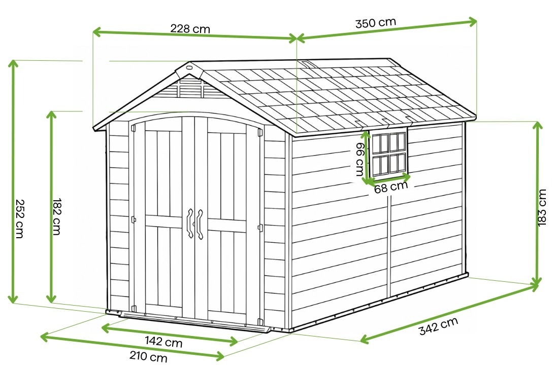 Domek ogrodowy Premier 7511 to pojemna i solidna konstrukcja, idealna do przechowywania narzędzi, mebli ogrodowych i akcesoriów sezonowych. Wykonany z trwałego polipropylenu o grubości 16 mm, jest odporny na promieniowanie UV oraz warunki atmosferyczne – bez potrzeby malowania czy konserwacji. Wnętrze doświetlają świetliki dachowe i okno, a wbudowany system wentylacyjny chroni przed wilgocią. Dach wzmocniony metalowymi elementami wytrzymuje obciążenie śniegiem do 100 kg/m², a podłoga skutecznie izoluje od podłoża. Niski próg i drzwi z możliwością zamknięcia na kłódkę zapewniają komfort i bezpieczeństwo użytkowania. Produkt objęty jest 10-letnią gwarancją producenta marki Keter.