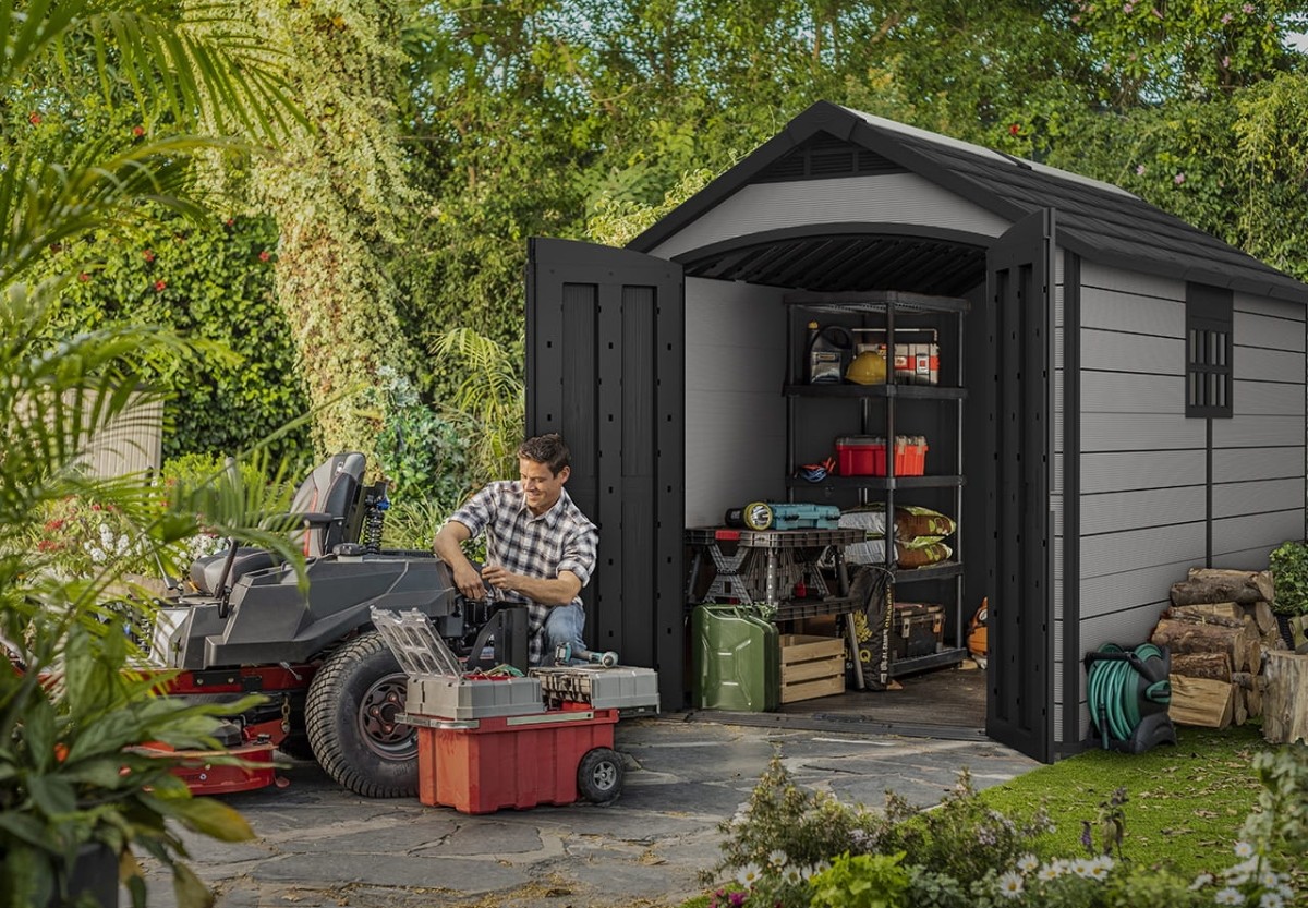 Drzwi wyposażone w miejsce na kłódkę pozwalają na bezpieczne przechowywanie cennych przedmiotów, a niski próg zapewnia swobodny dostęp nawet dla większego sprzętu ogrodowego.