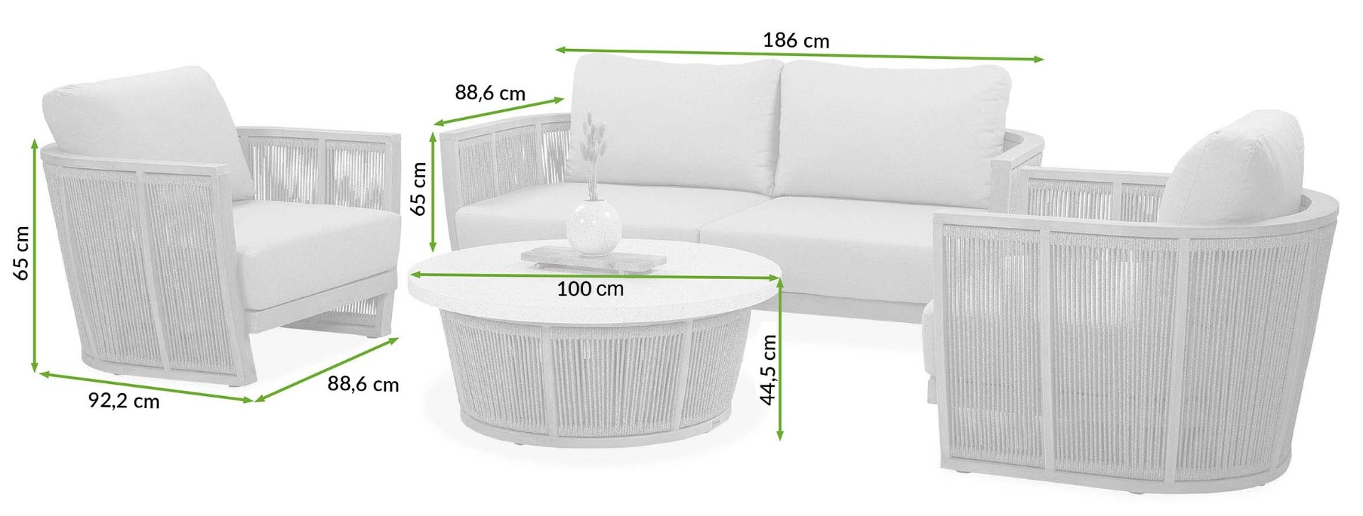 Zestaw składa się z: sofa, 2x fotel, stolik, poduszki