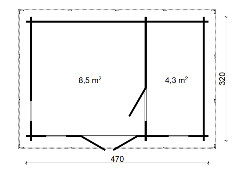 Całkowity wymiar domku wynosi 470x320 cm, a bez wystających elementów konstrukcyjnych 450x300 cm. Ściany o grubości 40 mm zapewniają solidność i trwałość konstrukcji. Przednia ściana ma wysokość 222 cm, a tylna 211 cm. Domek jest zwieńczony płaskim dachem o powierzchni 17,8 m² i minimalnym nachyleniu 2 stopni. Konstrukcja opiera się na impregnowanych belkach podwalinowych, co dodatkowo zwiększa jej wytrzymałość.