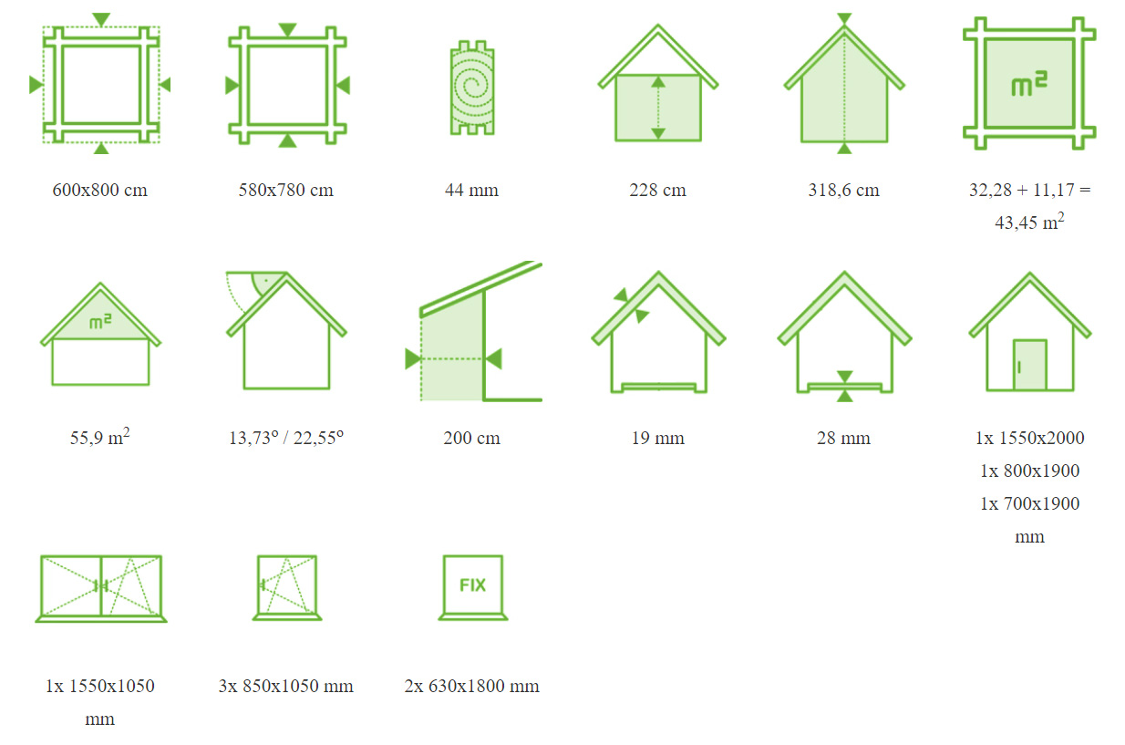 - Kąt nachylenia dachu: 13,73o, 22,55o