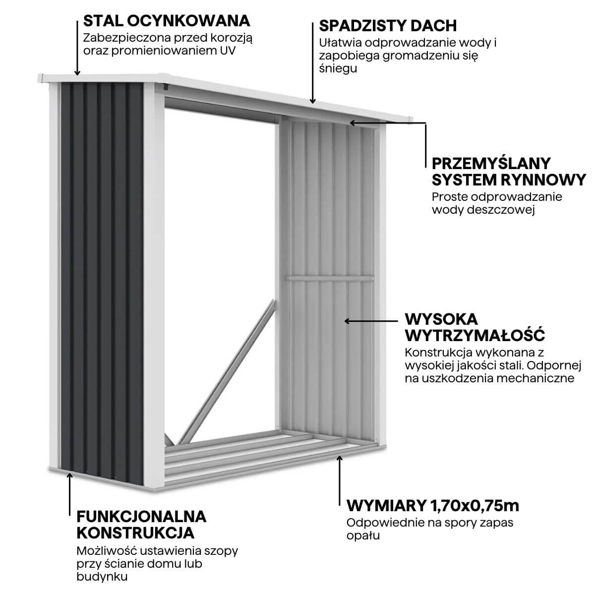 Domek narzędziowy Denver to doskonałe rozwiązanie dla osób, które szukają praktycznego i stylowego miejsca do przechowywania opału lub innych akcesoriów ogrodowych. Jego wytrzymała konstrukcja, oparta na stalowym stelażu oraz metalowych panelach, gwarantuje odporność na uszkodzenia mechaniczne i trudne warunki pogodowe. Zadaszenie z systemem rynnowym skutecznie odprowadza wodę, chroniąc przechowywane drewno przed wilgocią.a. Jej elegancki kolor doskonale komponuje się z otoczeniem, nie zaburzając estetyki ogrodu.
