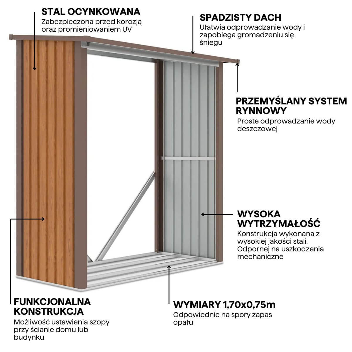 Drewutnia Denver stanowi praktyczne i eleganckie rozwiązanie dla każdego ogrodu, oferując przestrzeń do przechowywania drewna lub narzędzi. Wytrzymała konstrukcja, oparta na stalowym szkielecie i metalowych panelach, gwarantuje długotrwałą ochronę przed uszkodzeniami oraz działaniem warunków atmosferycznych. System rynnowy skutecznie odprowadza wodę, zabezpieczając przechowywane przedmioty przed wilgocią. Jego gustowny design i stonowany kolor Oak Brown harmonijnie współgrają z otoczeniem.