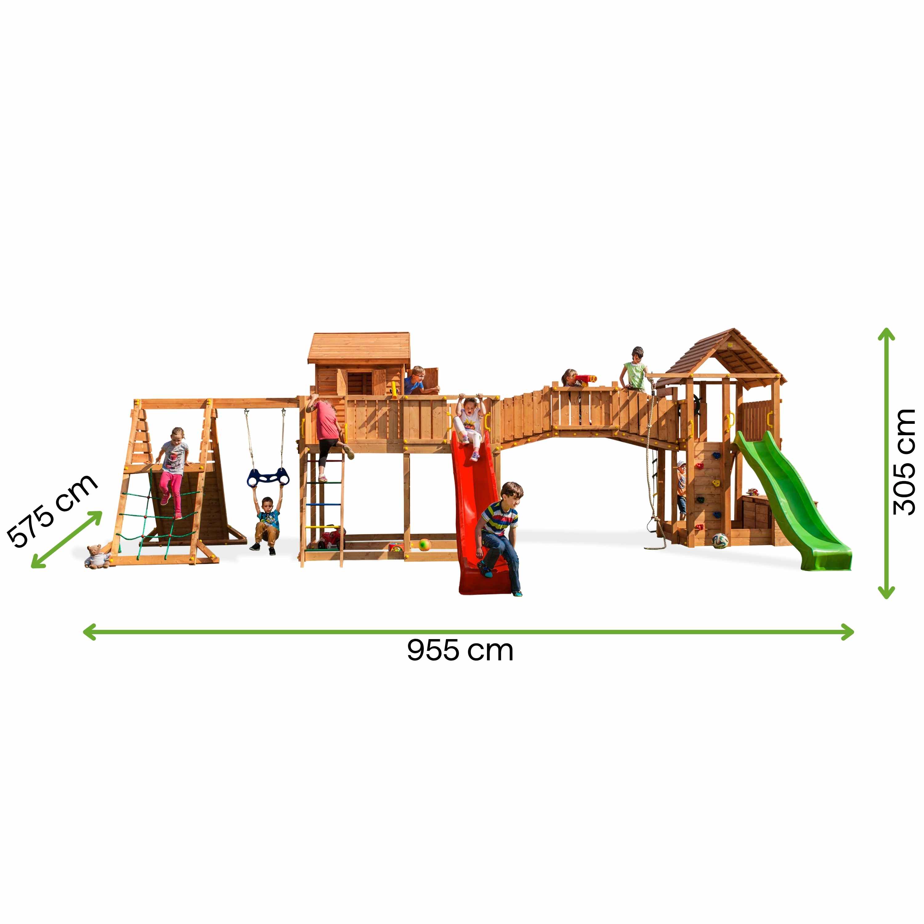 Plac zabaw Fungoo MAXI SPIDER LAND to potężna i najbardziej rozbudowana konstrukcja, która zmienia każdy ogród w prywatny park rozrywki. Ten imponujący zestaw powstał z połączenia domku MySPACE XL, wieży Fortress oraz modułów Rainbow i Spider+, tworząc wielopoziomowy system pełen niespodzianek. Do dyspozycji dzieci są aż dwie zjeżdżalnie o długości 2,9 m oraz trzy platformy rekreacyjne. Całość została wykonana z litego drewna sosnowego zabezpieczonego impregnatem teak, oferując bezpieczne miejsce przygód dla rekordowej liczby nawet 34 użytkowników jednocześnie.