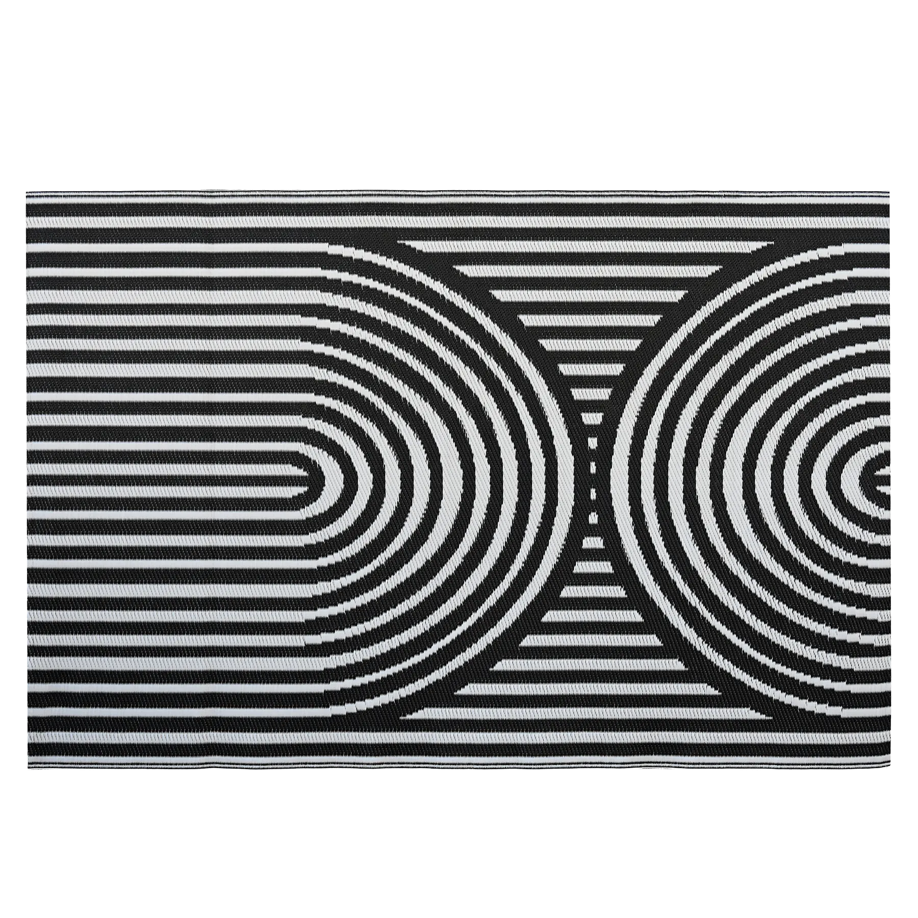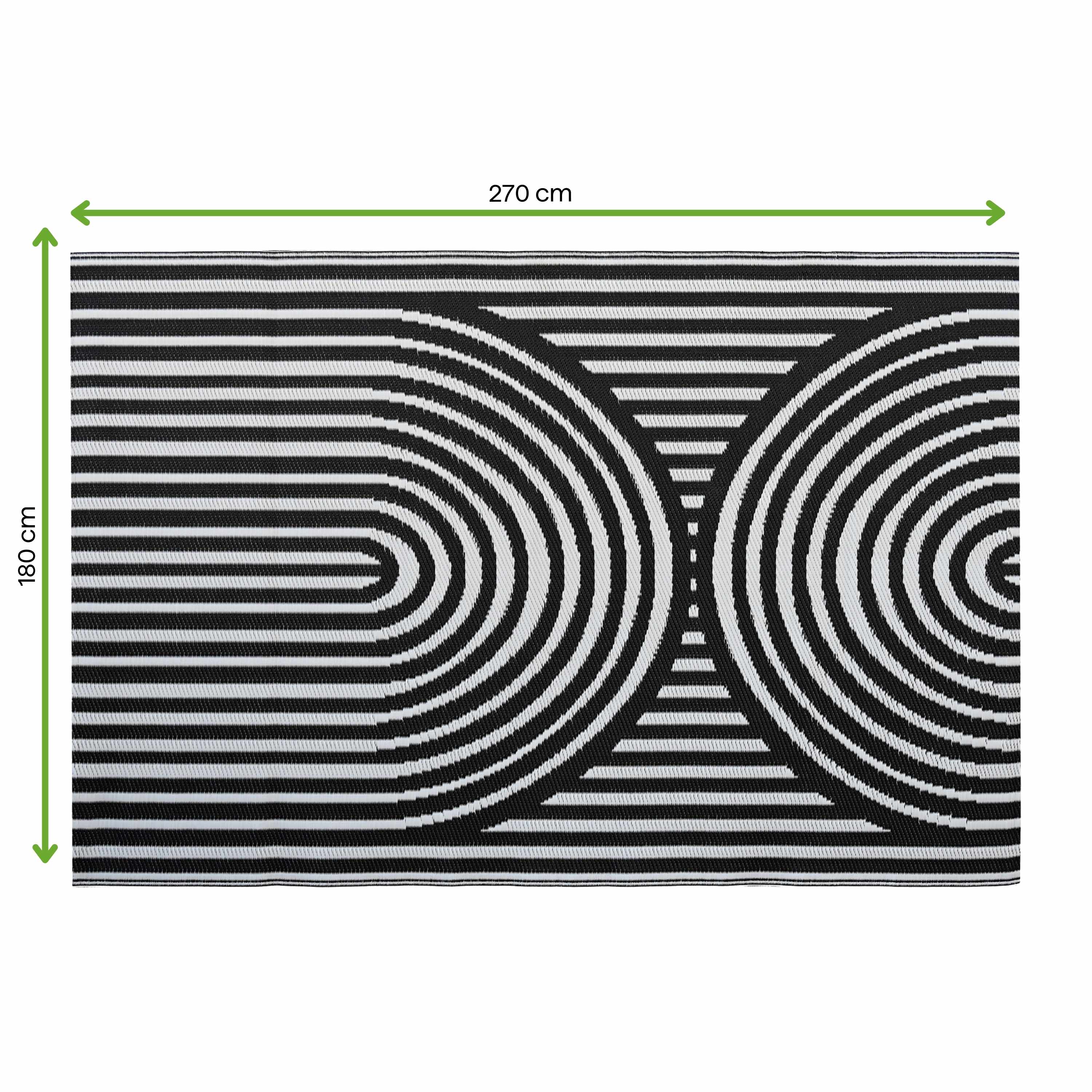 Dywan na taras 180x270 cm Black od MOODME wyróżnia się wyrazistym, czarno-białym wzorem opartym na rytmicznych, geometrycznych liniach, które nadają przestrzeni nowoczesny i uporządkowany charakter. Wykonany z trwałego polipropylenu, jest odporny na zmienne warunki atmosferyczne, nie chłonie wilgoci i zachowuje estetyczny wygląd przez długi czas, dzięki czemu świetnie sprawdzi się na tarasie, balkonie, patio, a także w pomieszczeniach o intensywnym użytkowaniu. Dywan jest wodoodporny oraz wyjątkowo łatwy w czyszczeniu, co czyni go praktycznym wyborem do codziennego użytku. Szeroka gama kolorystyczna kolekcji MoodME umożliwia dopasowanie modelu do różnych aranżacji, od minimalistycznych po bardziej wyraziste. Po rozpakowaniu zaleca się rozłożenie dywanu na płaskiej powierzchni na około 48 godzin oraz dociążenie narożników, aby szybciej uzyskał docelowy kształt.