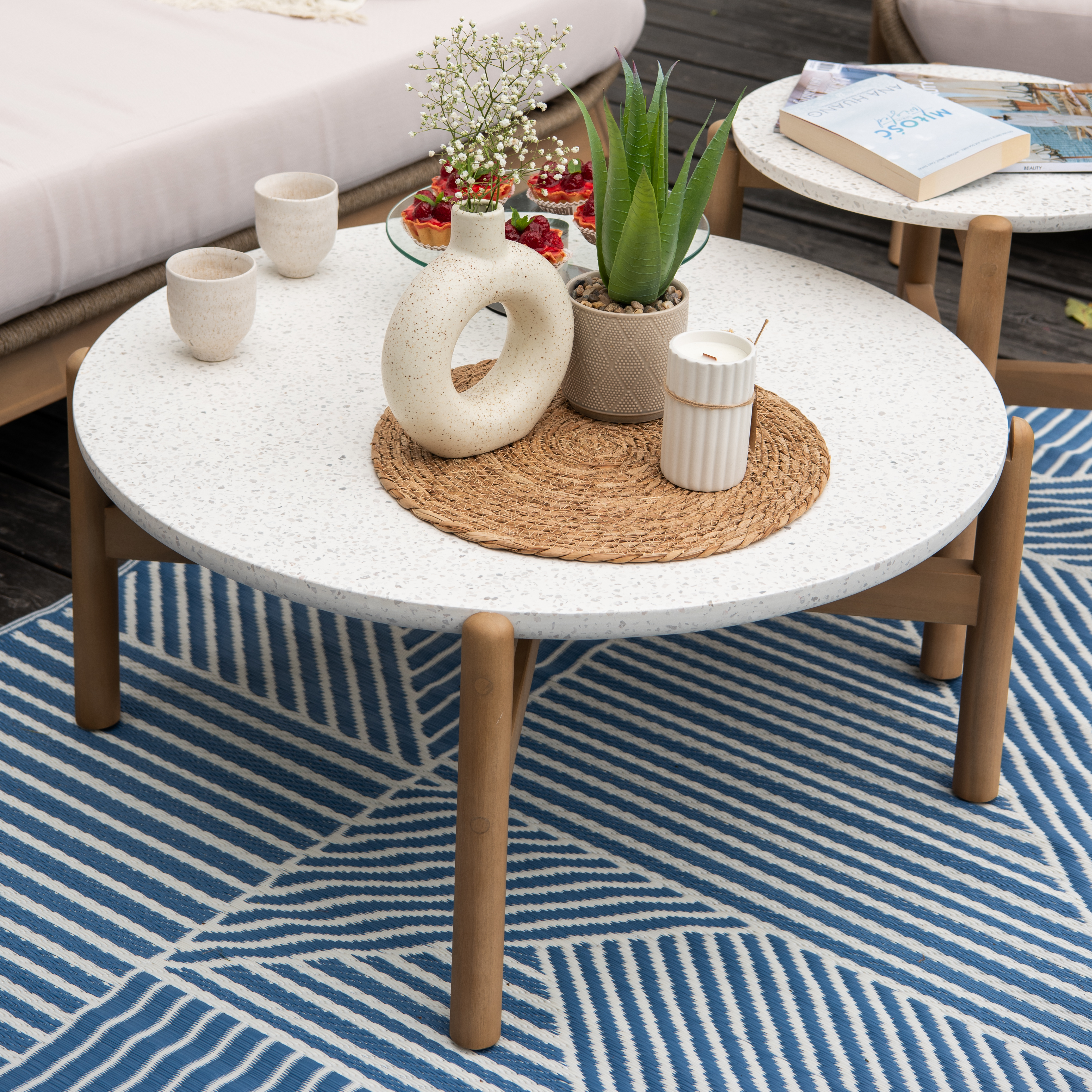 Dywan tarasowy Linear Blue 120x180 cm marki MOODME to idealne rozwiązanie dla osób poszukujących stylowego i funkcjonalnego dodatku do przestrzeni zewnętrznych. Wykonany z trwałych materiałów odpornych na działanie warunków atmosferycznych, doskonale sprawdzi się na tarasie, balkonie, w ogrodzie czy na werandzie. Dzięki wodoodpornej strukturze jest łatwy w czyszczeniu i odporny na wilgoć, co gwarantuje jego długotrwałe użytkowanie. Nowoczesny wzór Linear Blue nawiązuje do minimalistycznego stylu, podkreślając elegancję i harmonię przestrzeni. Odcień błękitu nadaje otoczeniu świeżości i subtelnej elegancji, idealnie komponując się z letnimi aranżacjami. Uniwersalny rozmiar 120x180 cm pozwala na szerokie zastosowanie – zarówno w przestrzeniach wypoczynkowych, jak i użytkowych. Dywan MOODME wyróżnia się nie tylko designem, ale także praktycznością. Jest lekki i łatwy w przechowywaniu, co czyni go wygodnym rozwiązaniem na każdą okazję. Można go z łatwością przenieść, zabrać na wyjazd lub schować po sezonie, bez obawy o uszkodzenia. Dzięki wysokiej jakości wykonania pozostaje estetyczny i funkcjonalny przez długi czas. Dywan tarasowy Linear Blue to połączenie estetyki i wygody, które spełni oczekiwania nawet najbardziej wymagających użytkowników. To doskonały wybór dla osób, które cenią sobie trwałość, nowoczesny design oraz komfort użytkowania na świeżym powietrzu.