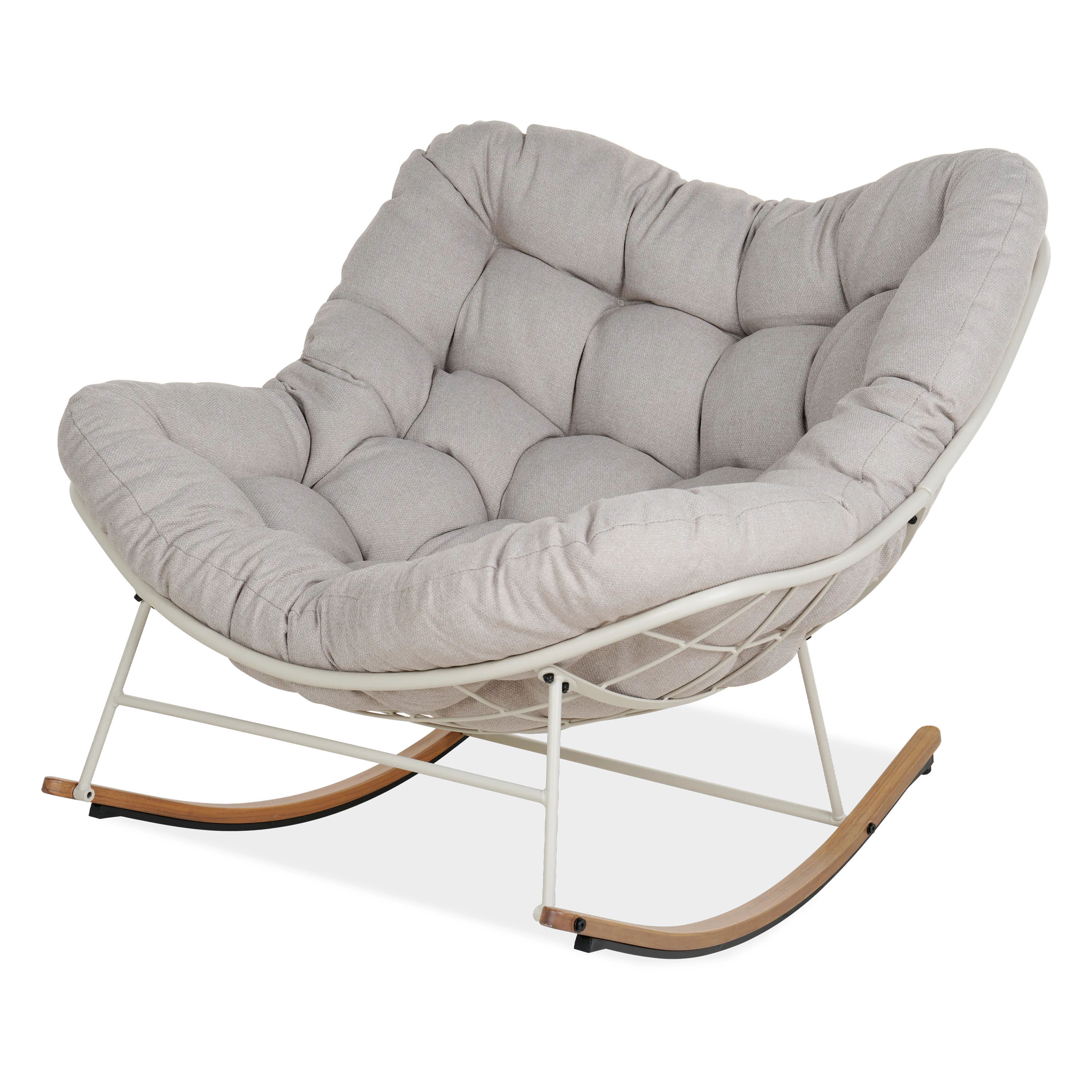 Fotel bujany RONDA Light Beige - BJORKKA to symbol najwyższego kunsztu i wyrafinowanego smaku, teraz w subtelnym odcieniu Light Beige. Ten ekskluzywny fotel bujany jest stworzony, by zachwycać i zapewniać niezrównany relaks, będąc idealnym meblem wypoczynkowym zarówno do wnętrz, jak i na zewnątrz. Konstrukcja opiera się na solidnej stalowej ramie malowanej proszkowo, zapewniającej długowieczność i stabilność (maks. obciążenie 110 kg). Designerskie płozy stalowe, wykończone termotransferowym nadrukiem imitującym drewno, dodają prestiżu. Kluczowym elementem jest poduszka wykonana z tkaniny olefinowej (230 g/m²), jest niewiarygodnie miękka, a jednocześnie wyjątkowo odporna na blaknięcie, plamy i wilgoć. Nie zalecamy prania poduszki a jedynie czyszczenie delikatną szmatką lub gąbką. Olefin to doskonały wybór dla mebli tarasowych, gwarantujący bez konieczności impregnacji. Wybierz fotel Ronda w kolorze Light Beige, by wnieść do swojej przestrzeni powiew luksusu i spokoju. Nie czekaj, zamów już dziś i odmień swój kącik relaksu!