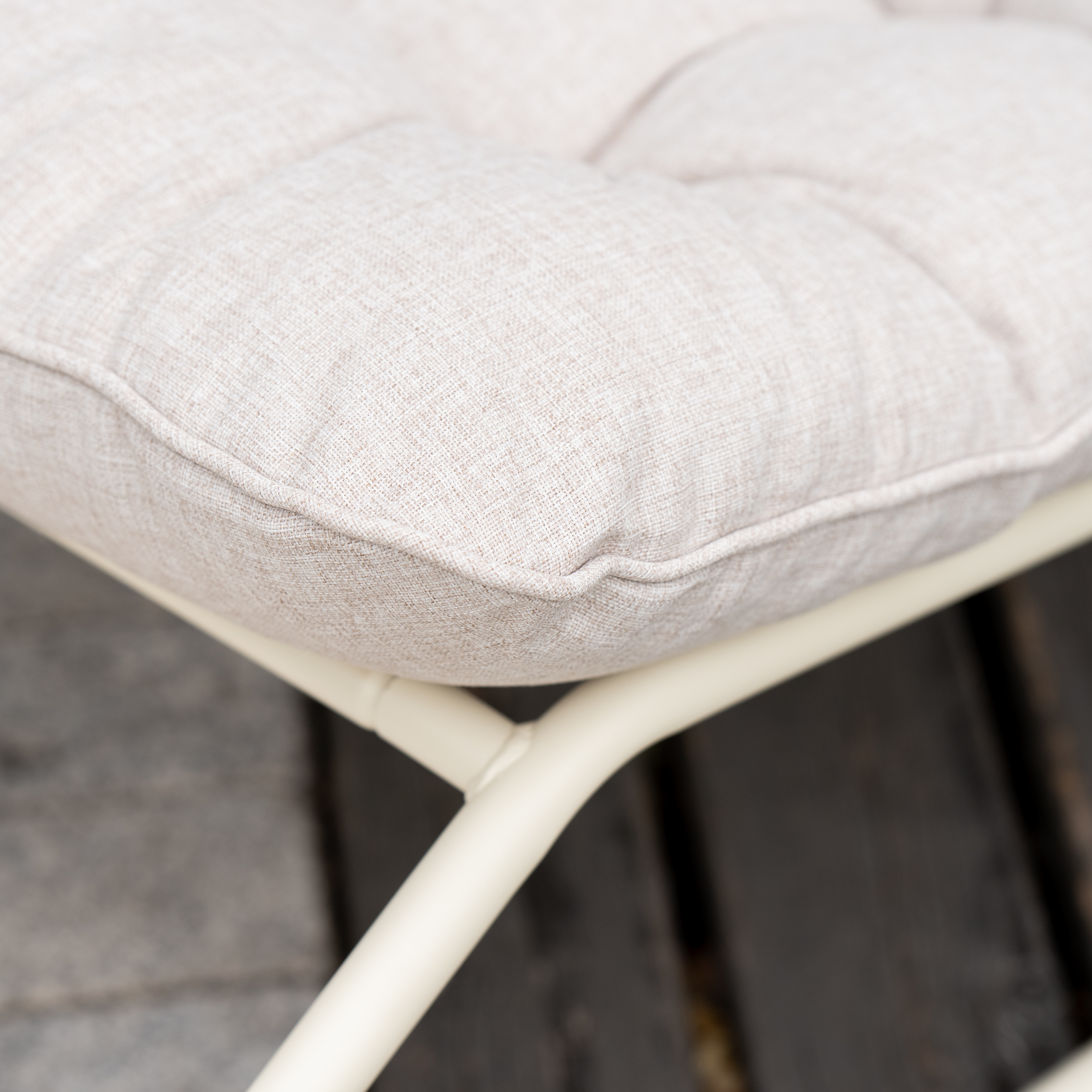 Odporny na codzienne użytkowanie – wytrzymała tkanina olefinowa podnosi estetykę i zapewnia trwałość poduszek, a stalowy blat stolika jest odporny na uszkodzenia i korozję.