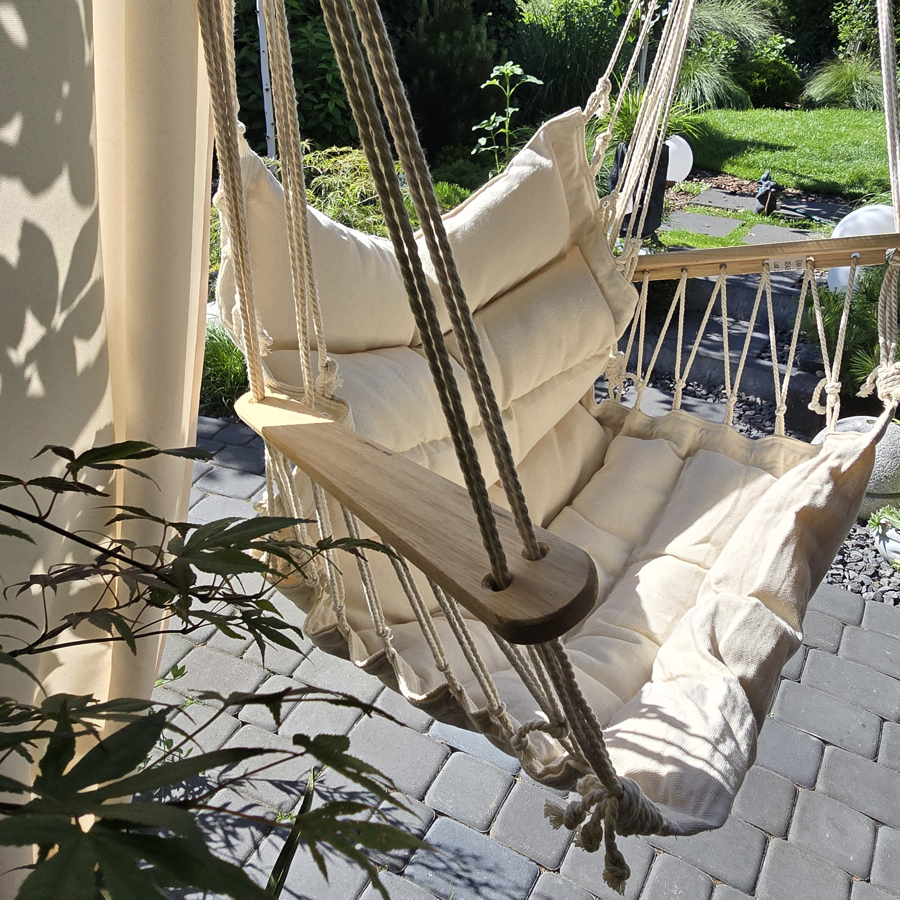 Solidna konstrukcja - fotel posiada drewniany drążek o długości 90 cm, który gwarantuje stabilność i wytrzymałość podczas użytkowania. Dzięki solidnej budowie oraz maksymalnemu obciążeniu do 100 kg, można być pewnym jego trwałości.