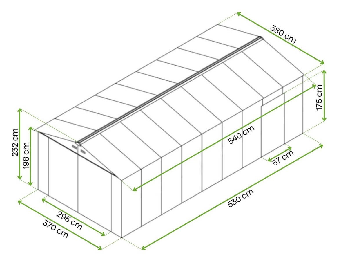 Dzięki wymiarom 380x540 cm, przestronne wnętrze garażu Kingston pozwala na wygodne przechowywanie większych pojazdów oraz innych niezbędnych narzędzi ogrodowych. Konstrukcja garażu charakteryzuje się łatwością montażu oraz demontażu, co umożliwia elastyczność w jego użytkowaniu, a także przenoszenie w inne miejsce, w zależności od potrzeb. Dwuspadowy dach garażu zapewnia skuteczne odprowadzanie wody opadowej oraz zapobiega gromadzeniu się śniegu, co zwiększa trwałość konstrukcji.