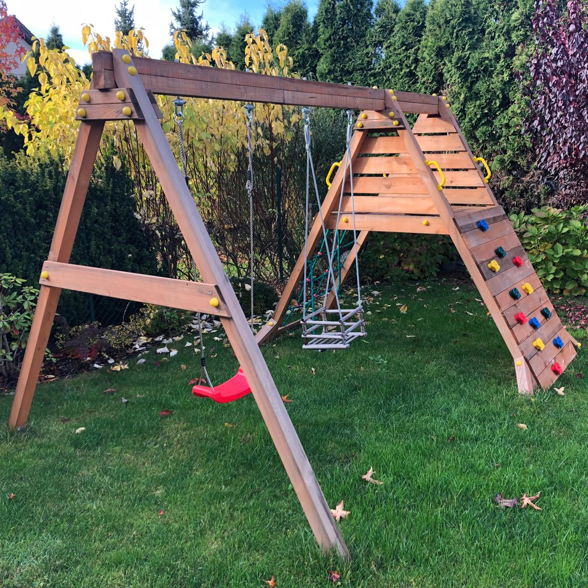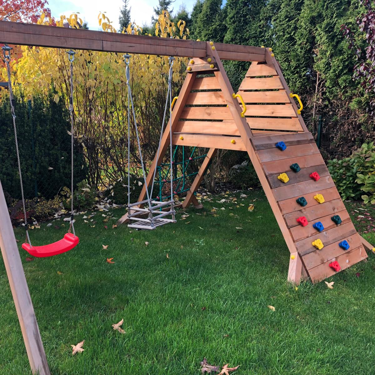 Zestaw zawiera 2 huśtawki, pajęczynę i mini ściankę wspinaczkową