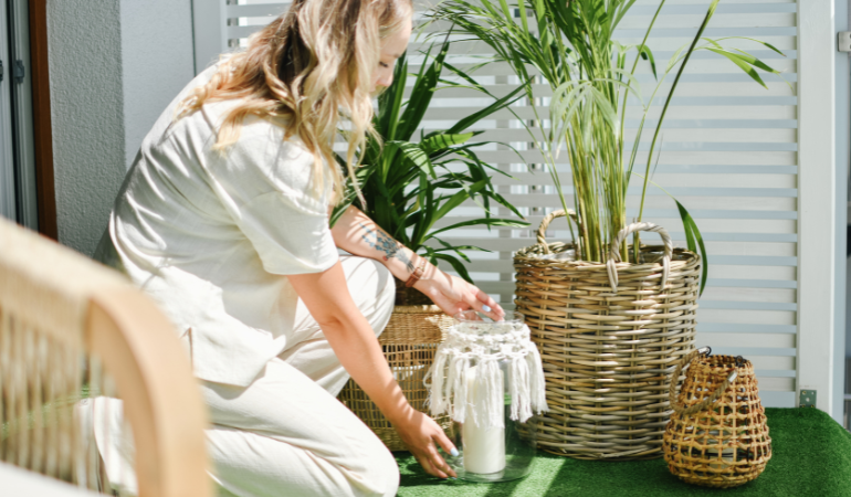 Styl boho uwielbia ciepłe, rozproszone światło – najlepiej naturalne, ale także pochodzące z lampionów i girland. Tego typu oświetlenie sprzyja wieczornemu relaksowi i buduje przytulną aurę. Girlandy LED, świece i lampy solarne są nie tylko praktyczne, ale też dekoracyjne. Dzięki nim balkon staje się nastrojowy niezależnie od pory dnia.