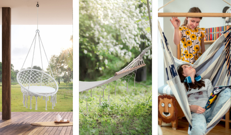Hamaki można z łatwością wkomponować w zieleń ogrodu, zawiesić na drewnianym tarasie lub w altanie, tworząc przytulną oazę relaksu. Co ciekawe, coraz częściej montuje się je również wewnątrz domu – w salonie, sypialni czy nawet pokoju dziecięcym. To świetne rozwiązanie, które pozwala cieszyć się błogim bujaniem nie tylko latem, ale przez cały rok.