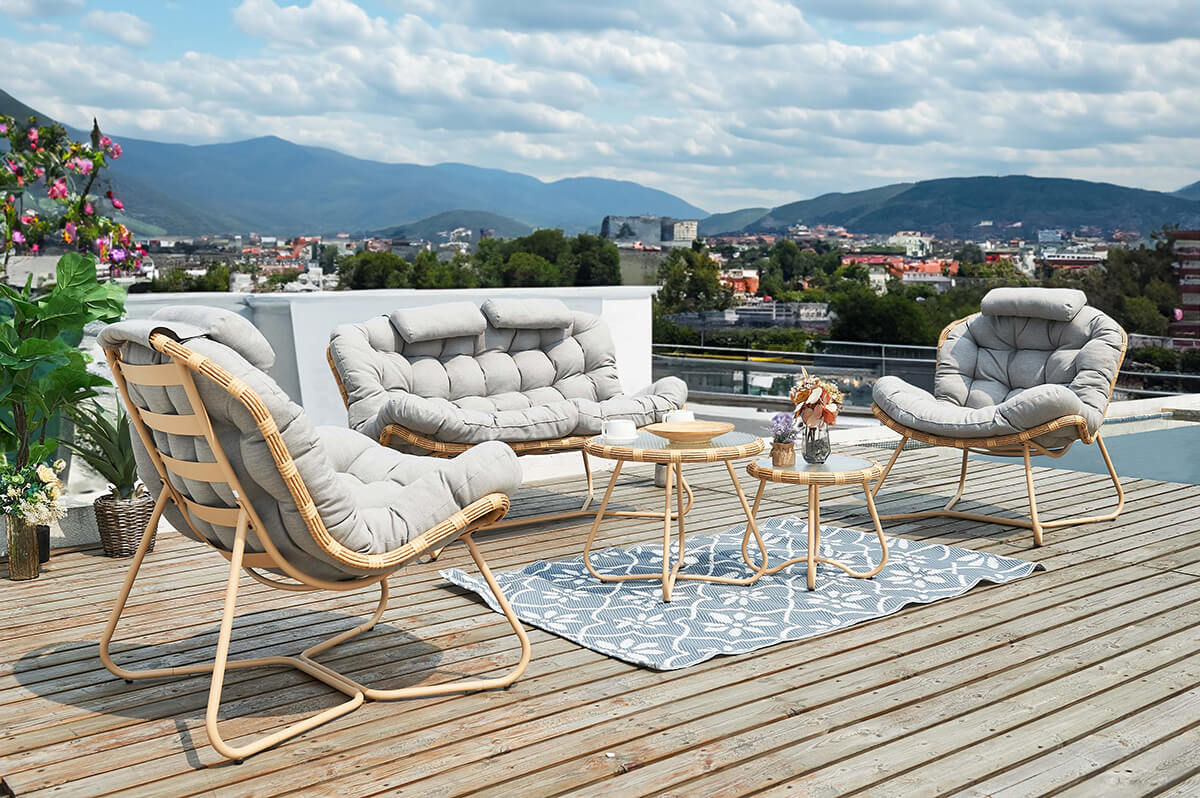 Idealnym przykładem takiego podejścia jest zestaw ROYAL Caffe Furrore – drewniana sofa, dwa fotele i stolik, które wyglądają jak przeniesione z domowego salonu, a jednak doskonale radzą sobie pod chmurką. Ich styl boho i wygodne poduchy tworzą idealną przestrzeń do relaksu – z książką, kawą lub przy kieliszku wina wieczorem.