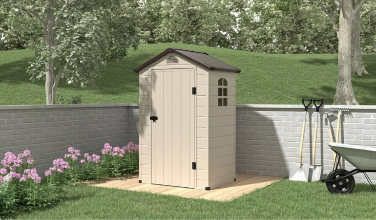 Domek narzędziowy wykonany w całości z dobrej jakości tworzywa sztucznego jest całkowicie wodoodporny. Nie ulega szkodliwemu działaniu promieniowania słonecznego ani innych ekstremalnych warunków pogodowych. To inwestycja na lata. Otwory wentylacyjne oraz okno zapewniające dopływ światła dziennego sprawiają, że wewnątrz panuje idealna wilgotność i temperatura. Przechowywane w domku sprzęty, nasiona czy worki z ziemią lub korą nie ulegają zniszczeniu. Wytrzymała podłoga chroni przed wilgocią, chłodem oraz gryzoniami. W zależności od potrzeb możemy wybrać domek z drzwiami jedno- lub dwuskrzydłowymi. W tym drugim wypadku dostęp do wnętrza jest naprawdę wygodny. Łatwo wjechać do środka kosiarką albo wstawić meble ogrodowe czy rowery. Zaletą nowoczesnych domków narzędziowych albo schowków na narzędzia jest jedno- lub dwuspadowy dach. Gwarantuje on bezpieczeństwo konstrukcji także zimą, kiedy pojawią się opady śniegu. Mróz nie szkodzi panelom, z których zbudowany jest domek - nie łuszczą się, nie pękają, nie blakną. Domki narzędziowe z nowoczesnych tworzyw sztucznych są (w odróżnieniu od modeli drewnianych) całkowicie bezobsługowe i nie wymagają dodatkowej konserwacji.