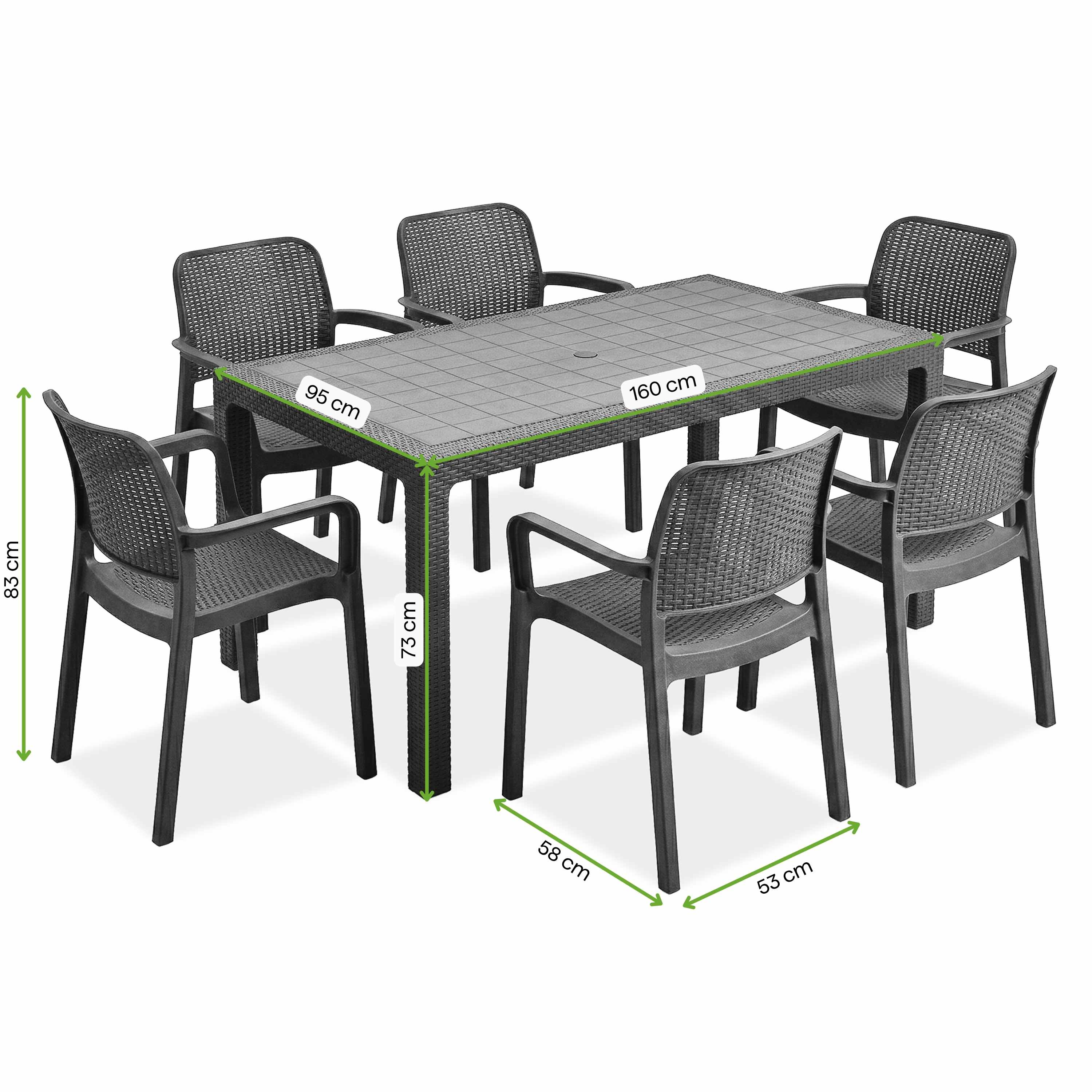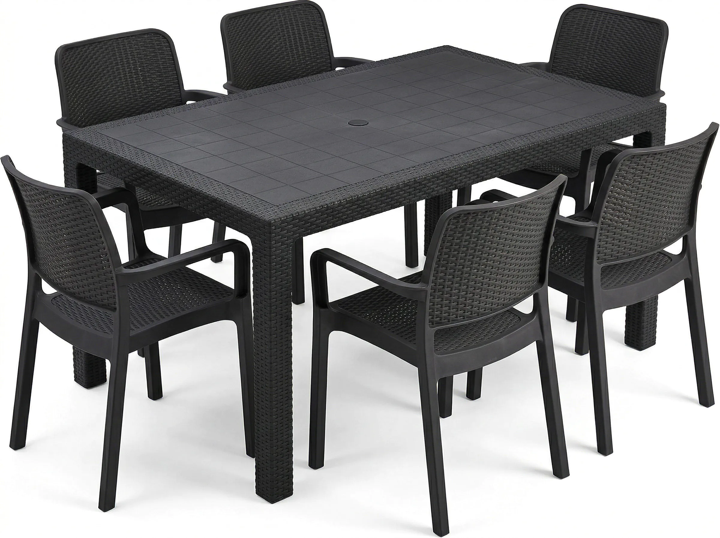 Komfort dla 6 osób – Duży stół zapewnia wygodne miejsce dla całej rodziny lub gości. To idealne rozwiązanie na wspólne posiłki na świeżym powietrzu.