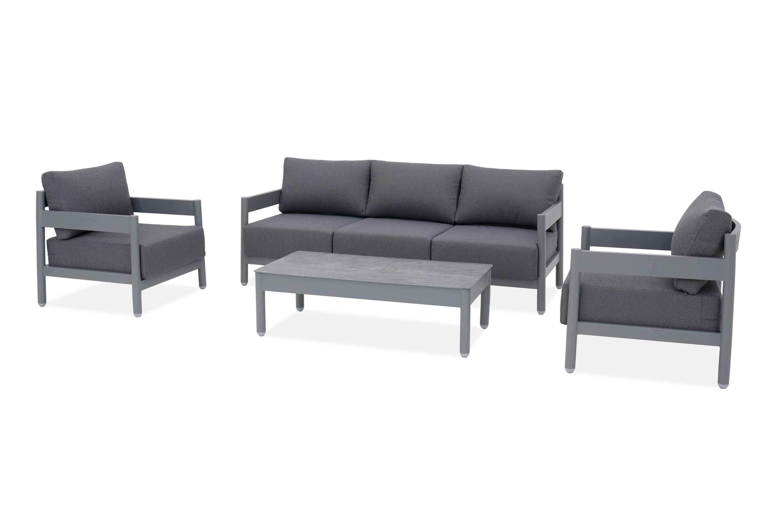Szukasz trwałych mebli na taras? Komplet mebli aluminiowych TREVIO CAFFE Grey marki FURRORE to synonim jakości i wygody. Aluminiowa konstrukcja odporna na warunki pogodowe oraz poduszki siedziska o grubości 20 cm gwarantują relaks na najwyższym poziomie. Zestaw obejmuje sofę dla 3 osób, 2 fotele i stolik z eleganckim ceramicznym wykończeniem. Wybierz tkaninę Olefin z funkcją łatwego zdejmowania pokrowców i ciesz się pięknym ogrodem bez kompromisów.
