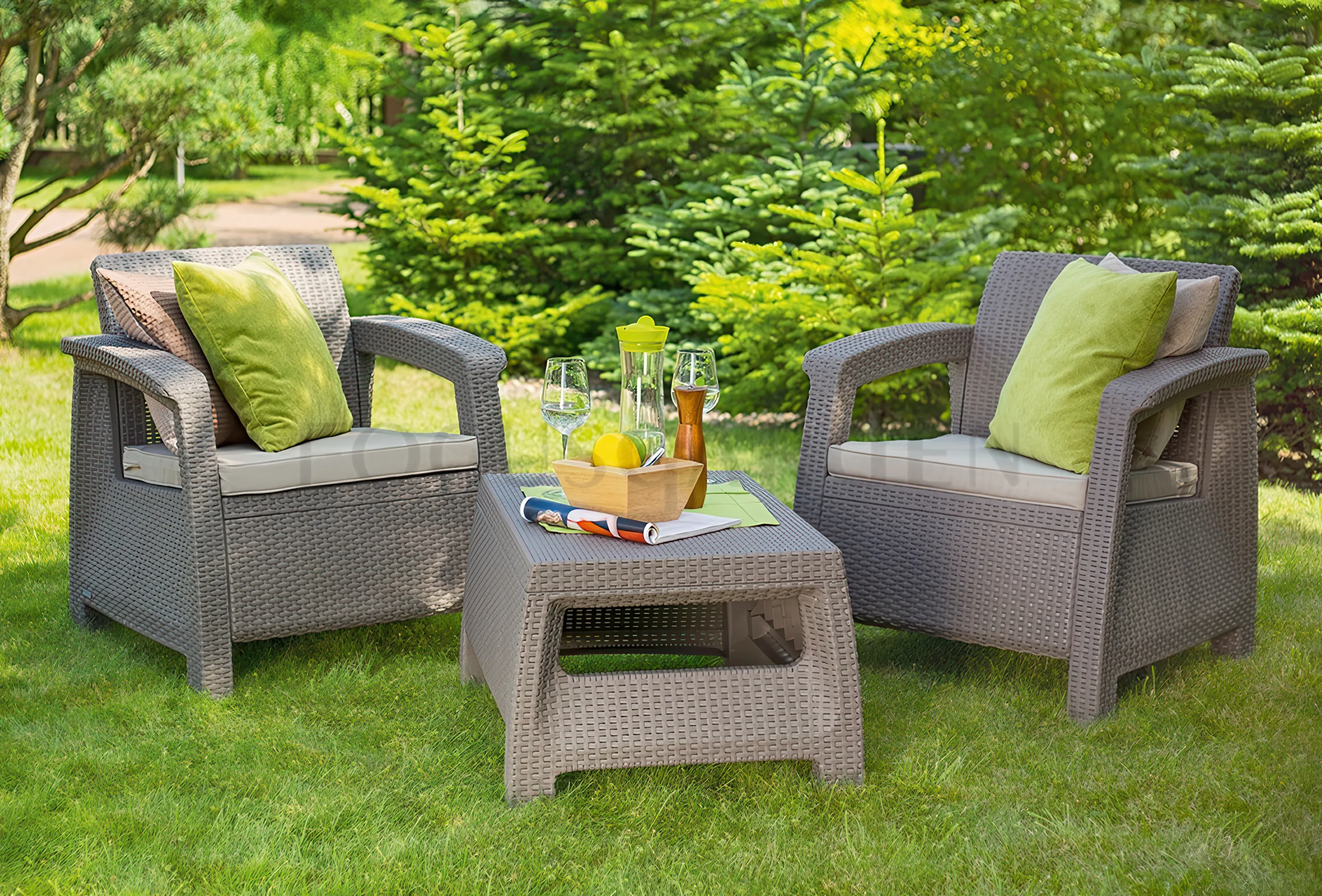 W skład zestawu wchodzą 2 wygodne fotele oraz stolik. Całość wykonana została z najwyższej jakości polipropylenu o strukturze naturalnego rattanu. Zastosowanie tworzywa sztucznego pozwoliło uzyskać maksymalną odporność na oddziaływanie warunków atmosferycznych. Odporność na promieniowanie UV sprawia, że kolor mebli nie zmienia się pomimo ekspozycji słonecznej. Poduszki z zamkiem błyskawicznym. Zestaw jest bardzo łatwy w czyszczeniu. Doskonały na balkony, małe tarasy. Produkt renomowanej marki CURVER (KETER GROUP).